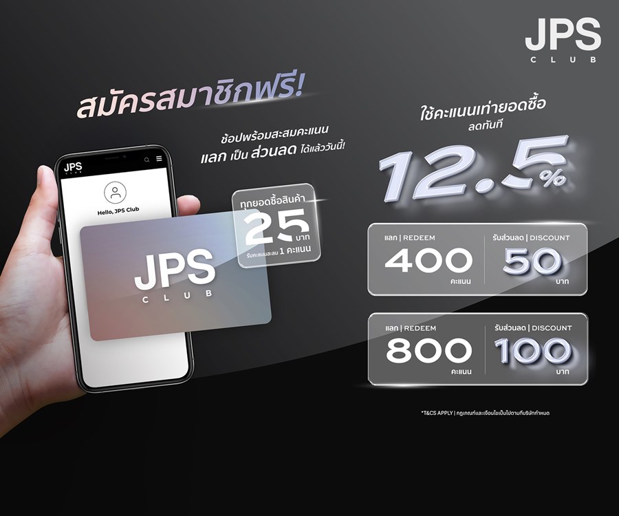 เนื่องในโอกาสครบรอบ 1 ปี JPS CLUB จึงได้เปิดตัวแอปพลิเคชั่น JPS CLUB เพื่อยกระดับความสุขให้กับสมาชิก สามารถใช้บริการได้สะดวกขึ้นกว่าเดิม พร้อมแทนคำขอบคุณสมาชิกคนพิเศษของ JPS CLUB ด้วยแคมเปญให้สมาชิกได้สนุกและลุ้นถึง 2 ต่อในทุก โดยแคมเปญพิเศษในเดือนตุลาคมนี้ คือ ต่อที่ 1 Surprise Point รับพ้อยท์ 3 เท่า – 5 เท่า คุ้มทันทีแบบไม่ต้องรอลุ้น เมื่อมียอดการซื้อขั้นต่ำ 2,000 บาทขึ้นไป ต่อด้วยแคมเปญต่อที่ 2 Lucky Draw ที่พร้อมให้ลูกค้าได้ลุ้นรับพ้อยท์สูงถึง 2 ล้านพ้อยท์ รวมทั้งสิ้น 62 รางวัล โดยจะประกาศผู้โชคดีในวันที่ 15 พฤศจิกายน 2566 ผ่านทางช่องทาง Social Media JPS Club และเว็บไซต์ jpsclub.com