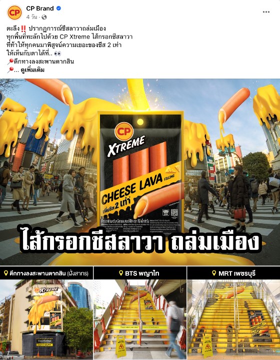 เพราะต้องการเจาะกลุ่มเป้าหมายกลุ่ม Gen Z ก็คือคนรุ่นใหม่ ที่ชื่นชอบความใหม่ ความสดอยู่เสมอ ดังนั้นเพื่อชูจุดเด่นของโปรดักซ์ CP Xtreme ไส้กรอกสอดไส้ชีสลาวา ตัวใหม่ที่มีไส้ชีสเยิ้ม ๆ เพิ่มปริมาณชีสเป็น 2 เท่า ด้วยความโดดเด่นของชีสเยิ้ม ๆ จึงตีโจทย์การสื่อสารมาเป็น Ambient Ads ที่ใช้ลาวาชีสทะลักของไส้กรอกมาใช้ประโยชน์ในเชิง Visual Stun ใช้ลาวาชีสไหลแนบเนียนไปกับพื้นที่ต่าง ๆ ไม่ว่าจะเป็นปะทุใส่ตึกบริเวณทางลงสะพานตากสิน ภาพชีสเยิ้ม ๆ ไหลตามบันไดลงสถานีรถไฟฟ้า MRT (สถานีเพชรบุรี) และ BTS (สถานีพญาไท) ซึ่งทำให้รับรู้ถึงความชีสเยิ้ม และกระตุ้นให้เกิดความอยากลองชิม
