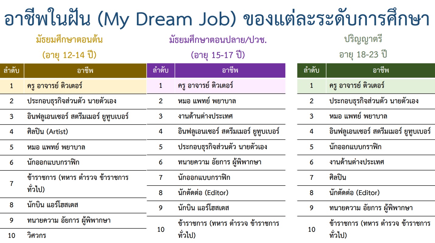 สรุปปัจจัยที่มีผลต่อการเลือกอาชีพในฝัน คือ เป็นที่ต้องการของตลาด/มีตำแหน่งงานรองรับแน่นอน 23.2% เงินเดือนและผลตอบแทนสูง 20.8% มีสภาพแวดล้อมการทำงานที่ดี 17.2% เลือกตามคนในครอบครัว 16.6% เลือกตามคนในครอบครัว 16.6% หางานง่ายมีโอกาสก้าวหน้าสูง 14.7% องค์กรมีชื่อเสียง ได้รับการยอมรับ 7.5%