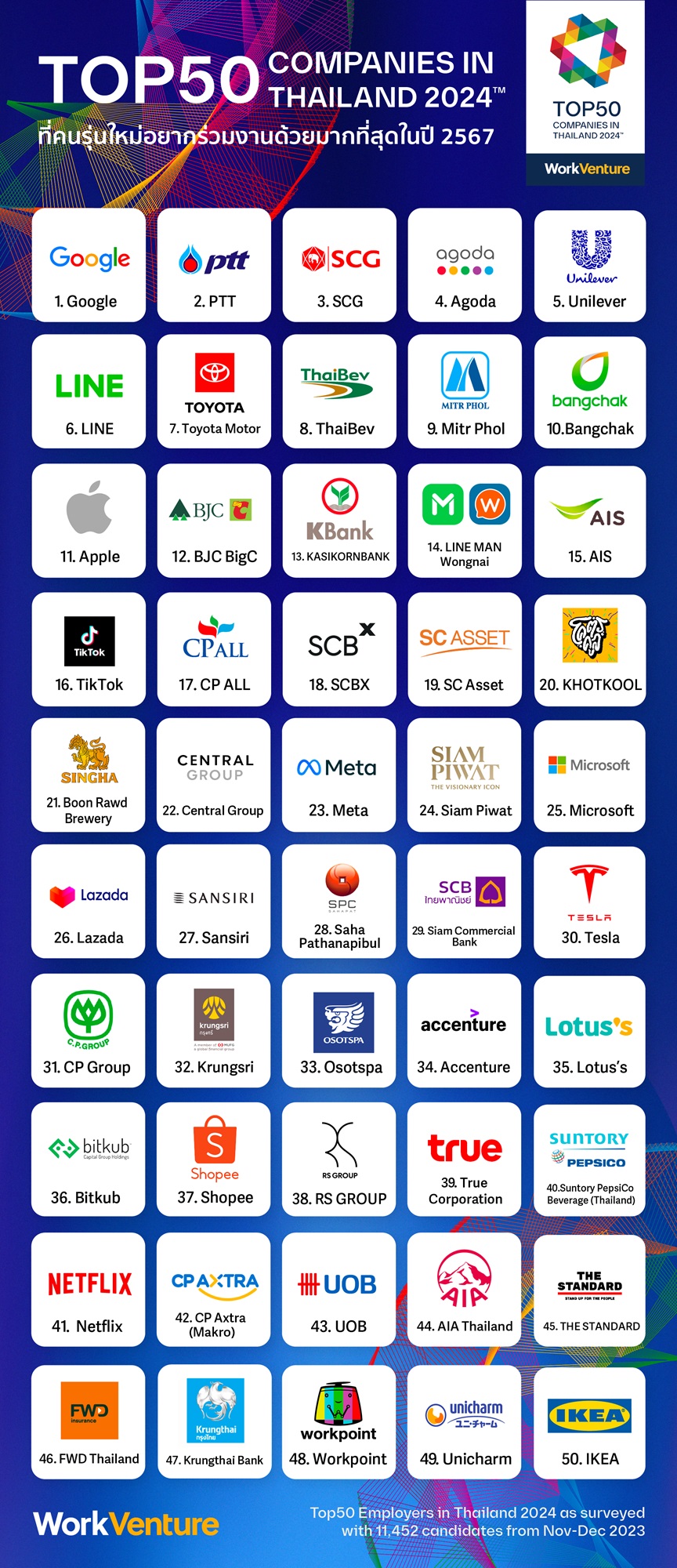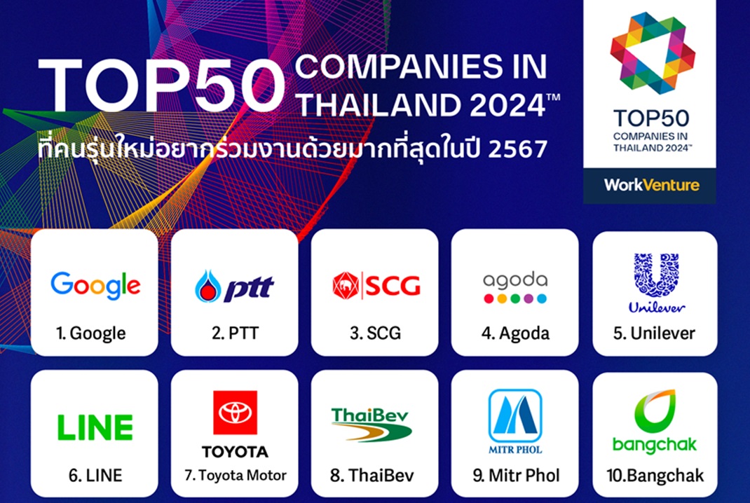 Top 50 Companies in Thailand 2024 บริษัทที่คนรุ่นใหม่อยากร่วมงานด้วยมากที่สุดประจำปี 2024 สรุปได้ดังนี้