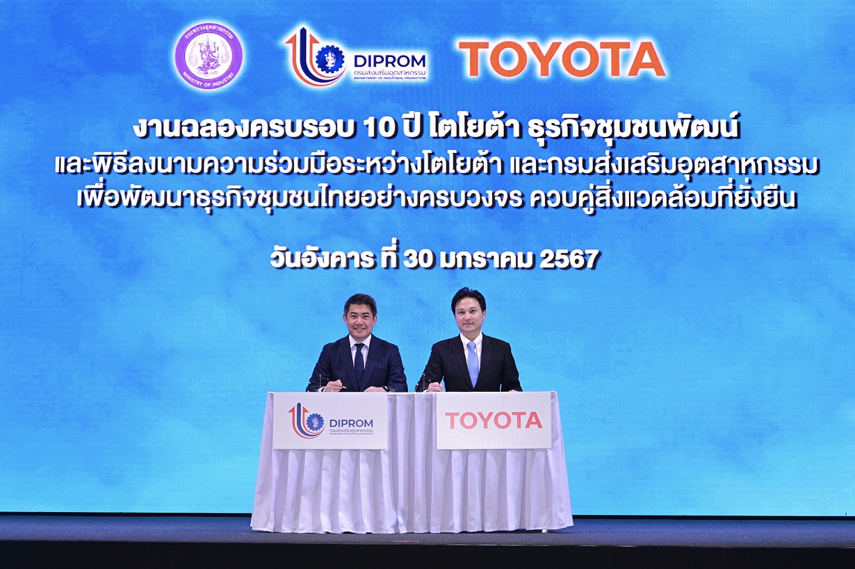 นายบรรจง สุกรีฑา รองปลัดกระทรวงอุตสาหกรรม นายภาสกร ชัยรัตน์ อธิบดีกรมส่งเสริมอุตสาหกรรม นายนันทวัฒน์ ศรีวรัตน์อัชกุล ผู้ช่วยกรรมการผู้จัดการใหญ่ บริษัท โตโยต้า มอเตอร์ ประเทศไทย จำกัด พร้อมด้วยคณะเจ้าหน้าที่จากกรมส่งเสริมอุตสาหกรรม และคณะผู้บริหารระดับสูง บริษัท โตโยต้า มอเตอร์ ประเทศไทย จำกัด ร่วมเป็นเกียรติภายในงานฉลองความสำเร็จครบรอบ 10 ปี โครงการโตโยต้าธุรกิจชุมชนพัฒน์ และพิธีลงนามบันทึกข้อตกลงความร่วมมือกับกรมส่งเสริมอุตสาหกรรม กระทรวงอุตสาหกรรม เพื่อยกระดับ การพัฒนาธุรกิจชุมชนไทยอย่างครบวงจร ควบคู่สิ่งแวดล้อมที่ยั่งยืน ณ TOYOTA ALIVE เมื่อวันอังคารที่ 30 มกราคม 2567 ที่ผ่านมา