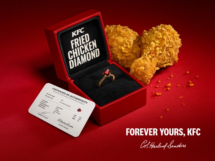 โดยงานนี้ได้ผ่านการออกแบบ ความชำนาญ และความประณีตจาก GEMORIES ผู้เชี่ยวชาญด้านการเปลี่ยนอินทรียสาร มาร่วมคอลแลบ ให้ไก่ทอด KFC กลายเป็นอัญมณีที่เลอค่าพร้อมเชิดชูความรัก โดยผ่านกระบวนการทางวิทยาศาสตร์ ที่จำลองกระบวนการกำเนิดอัญมณีตามธรรมชาติ โดยการนำ ‘ไก่ทอด KFC’ ไปผ่านความร้อนสูงถึง 1,800 องศา และผ่านแรงดัน 11 ชั่วโมง จนกลายเป็นอัญมณีจากไก่ทอดแท้ๆ แหวนวงนี้นี่แหละ One Ring rules them all หลอมรวมทุกรสชาติ ทั้งเผ็ด อร่อย กลมกล่อม ถึงเครื่อง