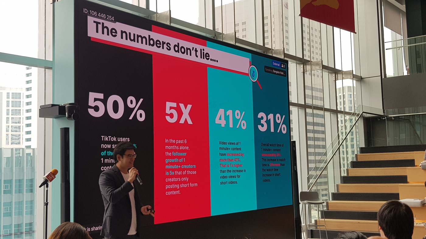 จากสถิติของ TikTok ยังพบด้วยว่า 50% ของผู้ใช้งานใช้เวลา 50% ของตนเองไปกับคอนเทนต์ที่มีความยาวมากกว่าหนึ่งนาที ซึ่งสะท้อนให้เห็นว่า ผู้ใช้งาน TikTok ไม่จำกัดตัวเองอยู่กับคอนเทนต์สั้น ๆ อีกต่อไป