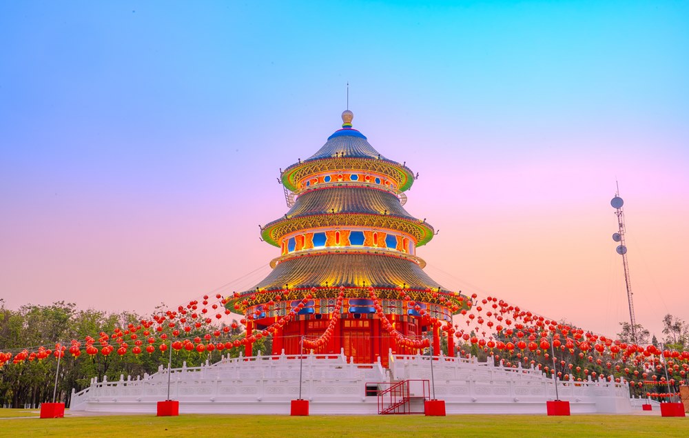 สำหรับวิหาร “อี่ ทง เทียน ไท้” เป็นวิหารที่จำลองแบบมาจากวิหารเทียนถาน กรุงปักกิ่ง ซึ่งสร้างขึ้นถูกต้องตามหลักฮวงจุ้ยทุกประการ เริ่มก่อสร้างมาตั้งแต่ปี 2558 โดยมูลนิธิ ดร.เทียม โชควัฒนา และคุณบุณยสิทธิ์ โชควัฒนา ประธานเครือสหพัฒน์ พร้อมด้วยเงินบริจาคจากผู้มีจิตศรัทธาในองค์พระโพธิสัตว์กวนอิม วิหารแห่งนี้ได้รับการออกแบบที่สื่อให้เห็นถึงแนวคิดเรื่องจักรวาล ภพภูมิ ความสมบูรณ์และมั่งมี ภายในวิหารประกอบด้วยชั้นใต้ดินและชั้นโถงประดิษฐานองค์พระโพธิสัตว์กวนอิม โดยชั้นใต้ดินจะมีเสาทั้งหมด 25 ตัน และชั้นโถงจะมีเสาทั้งหมด 24 ต้น เรียงรายรอบอาคารวิหาร โดยแบ่งเป็นวงใน 12 ต้น มีความหมายถึงเดือนทั้ง 12 เดือน และวงนอก 12 ต้น หมายถึงเวลา 12 ชั่วยาม หลังคาของวิหารมุงด้วยกระเบื้องหลังคาแบบเซรามิกโซลาร์เซลล์สีเขียว เพื่อผลิตพลังงานทดแทน นับเป็นวิหารแห่งแรกในประเทศไทยที่ใช้กระเบื้องโซลาร์เซลล์ รวมถึงติดตั้งเสาล่อฟ้าที่เปรียบเสมือนการรับพลังจากเบื้องบน เชื่อกันว่าคนที่มากราบไหว้ขอพรจะมีสุขภาพดี มีโชคลาภ ภายในวิหารประดิษฐานองค์พระโพธิสัตว์กวนอิม ซึ่งเป็นหนึ่งในหลายพระโพธิสัตว์ตามคติความเชื่อของพุทธศาสนานิกายมหายาน องค์พระโพธิสัตว์กวนอิมองค์นี้ แกะสลักมาจากก้อนหยกชิ้นใหญ่โดยช่างแกะสลักชาวจีน มีขนาดความสูง 2.62 เมตร หนัก 2.8 ตัน เมื่อรวมฐานดอกบัว ฐานมังกร และฐานแปดเหลี่ยมแล้ว จะมีความสูงรวมถึง 5 เมตร และหนักมากถึง 14.43 ตัน แกะสลักเป็นปางประทานพรประทับบนหลังพญามังกร ที่มือของพระองค์ถือแจกันประทานน้ำอมฤต น้ำมนต์ศักดิ์สิทธิ์ และกิ่งหลิว ไว้คอยชะล้าง ขจัดปัดเป่าทุกข์โศกโรคภัยของผู้ที่มากราบไหว้ขอพร และยังเป็นเสมือนน้ำทิพย์ที่ชโลมกายใจให้สะอาดบริสุทธิ์ ชุ่มฉ่ำด้วยน้ำพระทัยแห่งความเมตตาที่ยากจะหาใดเปรียบได้ องค์พระโพธิสัตว์กวนอิมประทับยืนบนหลังพญามังกรเวียนว่ายกลางมหาสมุทร ซึ่งพญามังกรเปรียบได้กับความมั่งคั่งร่ำรวย สายน้ำเปรียบได้กับความลื่นไหลราบรื่น สำเร็จ ร่ำรวย
