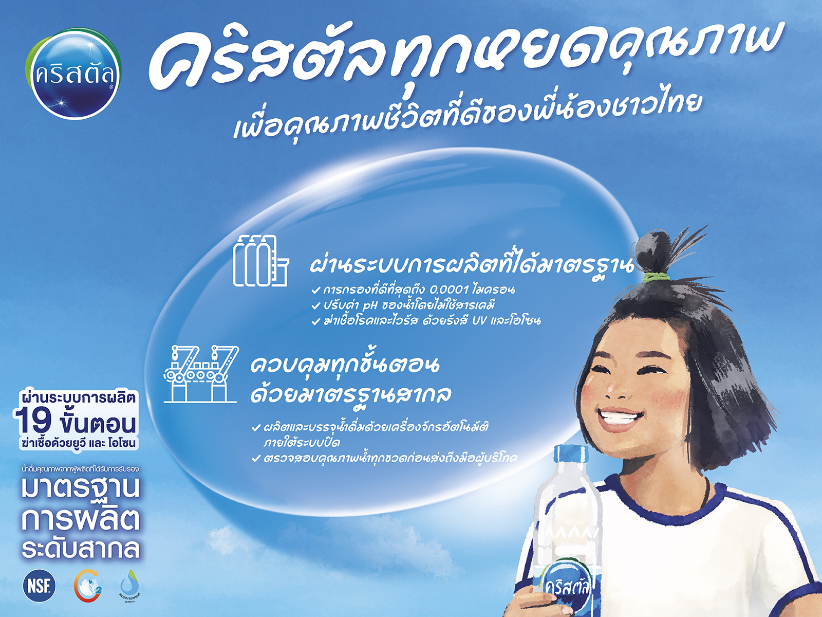 - แพ็กเกจจิ้ง : สร้างสรรค์ฉลากบรรจุภัณฑ์ที่ถ่ายทอดแนวคิด “คริสตัลทุกหยดคุณภาพ เพื่อพี่น้องชาวไทย” ผ่านภาพวาดสีน้ำฝีมือนักวาดภาพประกอบสายแฟชั่น “หยก กฤติน (Yoky)” กับลายเส้นและการลงสีที่เป็นซิกเนเจอร์ จาก 4 ดีไซน์ที่สื่อสารถึงน้ำดื่มคุณภาพที่อยู่คู่วิถีชีวิตพี่น้องชาวไทยในแต่ละภูมิภาค ได้แก่ ภาพเด็กจากภาคอีสาน ภาพครอบครัวจากภาคกลาง ภาพเกษตรกรจากภาคเหนือ และภาพชาวประมงจากภาคใต้