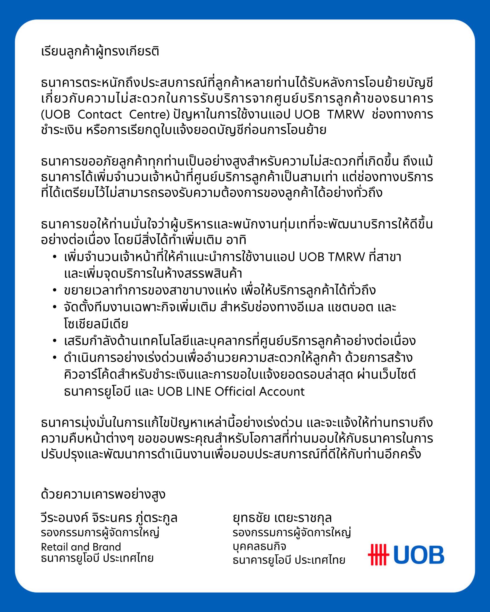 วันที่ 5 พฤษภาคม 2567 เฟซบุ๊กเพจ UOB โพสต์ขออภัยลูกค้าเกี่ยวกับประสบการณ์ที่ได้รับหลังการโอนย้ายบัญชี และแนวทางพัฒนาบริการดังนี้
