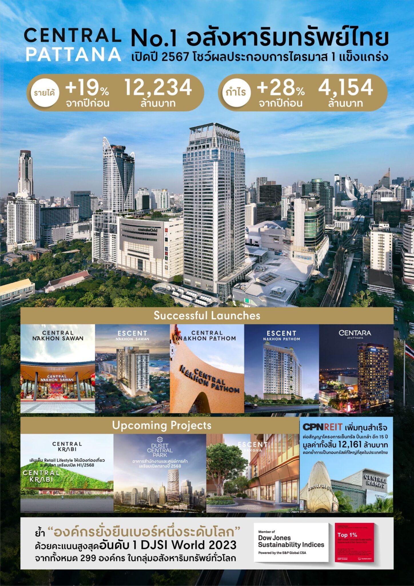 ขณะที่การดำเนินกลยุทธ์ธุรกิจแบบผสม (Mixed-use Development) ซึ่งเป็นจุดแข็งของบริษัทฯ ส่งผลให้ไตรมาส 1 ปี 2567 บริษัท เซ็นทรัลพัฒนา จำกัด (มหาชน) มีผลประกอบการที่ดีขึ้นจากปีก่อนหน้าอย่างมีนัยสำคัญในทุกๆ กลุ่มธุรกิจ โดยเฉพาะธุรกิจที่พักอาศัยที่มีรายได้เพิ่มขึ้นเกือบเท่าตัวเมื่อเทียบกับไตรมาสเดียวกันปีก่อนหน้า โดยไตรมาสที่ 1 ปี 2567 เซ็นทรัลพัฒนา มีรายได้รวม 12,234 ล้านบาท โต 19% และกำไรสุทธิ 4,154 ล้านบาท โต 28% จากปีก่อน