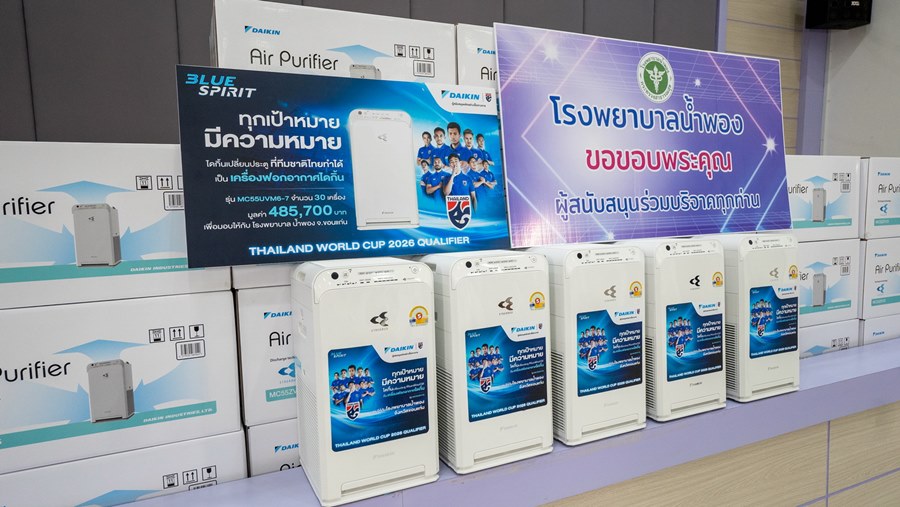 นายวัลลภ พ่วงไพโรจน์ กรรมการบริษัทและผู้จัดการทั่วไปอาวุโส บริษัทไดกิ้น อินดัสทรีส์ (ประเทศไทย) จำกัด กล่าวถึงบทสรุปความสำเร็จของแคมเปญ “ทุกเป้าหมาย มีความหมาย” ว่า “แคมเปญนี้ไดกิ้นได้เชิญชวนคนไทยร่วมเชียร์ฟุตบอลทีมชาติไทย ในการแข่งขันฟุตบอลโลกรอบคัดเลือกโซนเอเชีย ตั้งแต่ช่วงปลายปีที่แล้วจนถึงเมื่อเดือน มิ.ย.67 ที่ผ่านมา เพื่อให้ทีมชาติไทยมีขวัญและกำลังใจและคว้าชัยชนะในการแข่งขันในแต่ละแมตช์ ซึ่งในฐานะที่ไดกิ้นเป็นผู้เชี่ยวชาญด้านอากาศและเป็นผู้สนับสนุนหลักฟุตบอลทีมชาติไทย จึงได้จัดแคมเปญสนุกๆ “ทุกเป้าหมาย มีความหมาย” ทั้งช่องทาง Online และ On-ground โดยตั้งเป้าหมายบริจาคเครื่องฟอกอากาศ สำหรับการแข่งขันฟุตบอลโลกรอบคัดเลือกในทั้ง 5 นัดที่ผ่านมา ซึ่งทุกๆ 1 ประตู ที่ทีมชาติไทยทำได้ เราบริจาคเพิ่มประตูละ 5 เครื่อง โดยเราได้บริจาคเครื่องฟอกอากาศไดกิ้น รุ่น MC55UVM6-7 ซึ่งผลการแข่งขันทำให้เราได้ยอดการบริจาคเครื่องฟอกถึง 55 เครื่อง ใน 3 โรงพยาบาลได้แก่ โรงพยาบาลนครพิงค์ จ. เชียงใหม่ จำนวน 10 เครื่อง ในช่วงเดือน พ.ย.66 โรงพยาบาลชลบุรี จ.ชลบุรี 15 เครื่อง ในช่วงเดือน มี.ค. 67 และ ปิดท้ายที่ โรงพยาบาลน้ำพอง จังหวัดขอนแก่น 30 เครื่อง ในช่วงเดือน มิ.ย. 67 ซึ่งทั้ง 3 โรงพยาบาลอยู่ในพื้นที่ที่มีผลภาวะฝุ่น PM 2.5 และตั้งอยู่ในเขตอุตสาหกรรม รวมมูลค่าทั้งสิ้นกว่า 900,000 บาท”