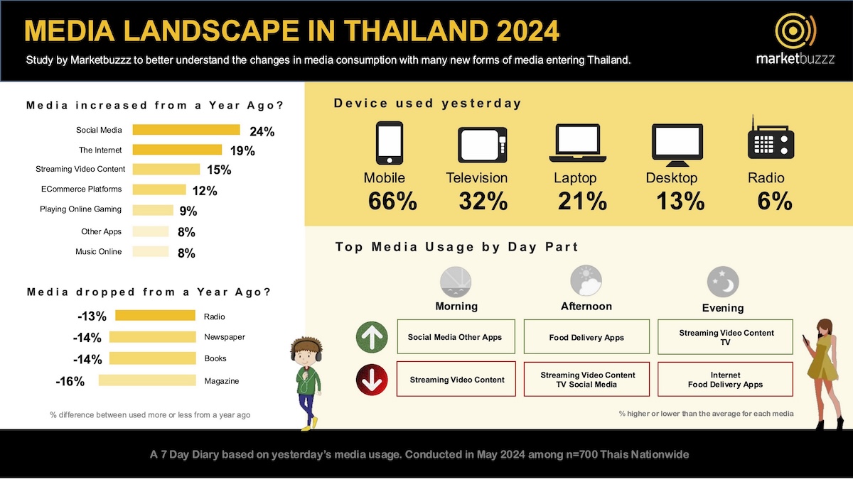 แม้คนไทยจะมีการใช้งานโซเชียลมีเดีย อินเทอร์เน็ต วิดีโอสตรีมมิ่ง และแพลตฟอร์มอีคอมเมิร์ซ เพิ่มขึ้นจากปีที่แล้ว แต่สื่อแบบดั้งเดิมอย่างวิทยุ หนังสือพิมพ์ หนังสือ และนิตยสารกลับมีการใช้งานลดลง อย่างไรก็ตาม กลุ่มผู้สูงวัยที่มีอายุ 50 ปีขึ้นไป ยังคงนิยมบริโภคสื่อเหล่านี้มากกว่า ข้อมูลนี้สะท้อนให้เห็นว่ากลยุทธ์การใช้สื่อแบบดั้งเดิมจำเป็นต้องได้รับการปรับเปลี่ยน เนื่องจากพฤติกรรมการบริโภคสื่อของคนไทยกำลังเปลี่ยนไปสู่รูปแบบดิจิทัลและเน้นการใช้งานบนมือถือมากขึ้น แบรนด์ต่างๆ ควรปรับกลยุทธ์ให้มีความยืดหยุ่นและตรงกลุ่มเป้าหมายมากขึ้น เพื่อให้เข้าถึงกลุ่มลูกค้าหลักได้อย่างมีประสิทธิภาพ
