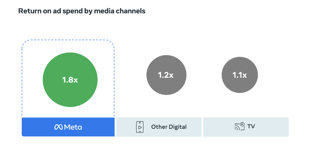 ผลการวิเคราะห์เชิงเปรียบเทียบจาก Meta และ Kantar พบว่า แคมเปญที่ดำเนินการบนแพลตฟอร์มของ Meta มีมูลค่า ROAS สูงสุดถึง 1.8 เท่า คิดเป็น 16% ของยอดขายสื่อที่เพิ่มขึ้นด้วยส่วนแบ่งการใช้จ่ายเพียง 10% ซึ่งมากกว่าแพลตฟอร์มดิจิทัลอื่นๆ และสื่อโทรทัศน์ ทำให้เห็นถึงประสิทธิภาพของแพลตฟอร์ม Meta ในการขับเคลื่อนธุรกิจให้ประสบความสำเร็จ