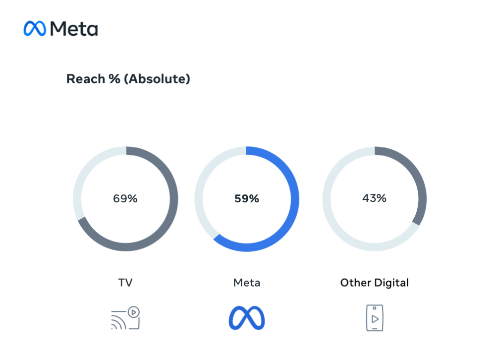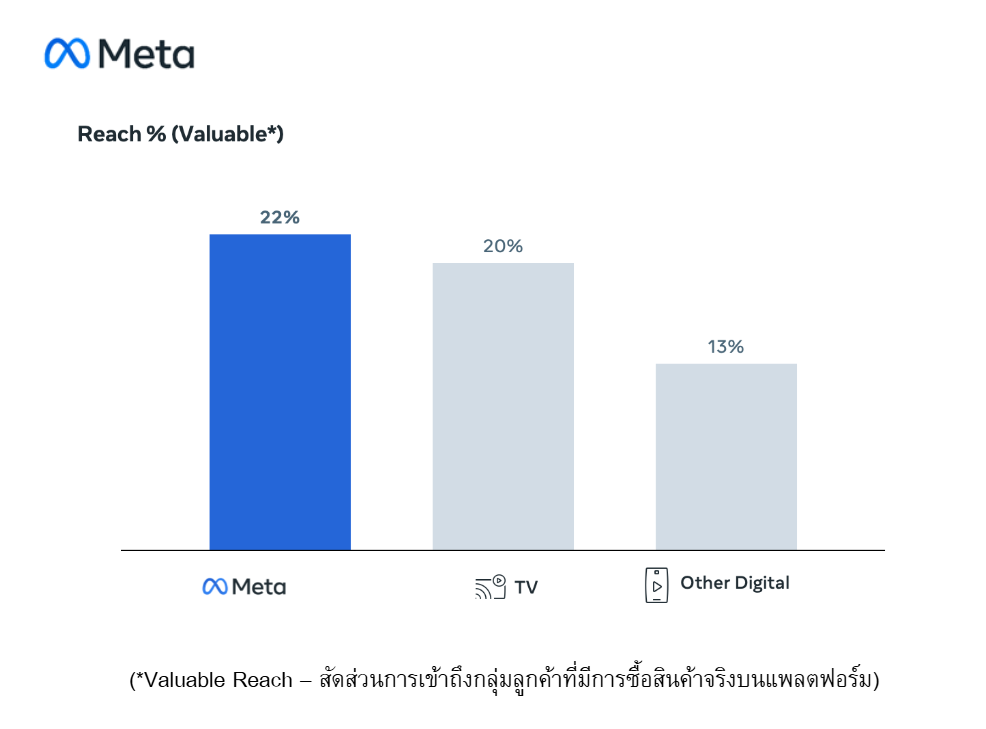 แคมเปญบนแพลตฟอร์มของ Meta มียอดการเข้าถึงหรือ Reach มากถึง 59% โดยมีสัดส่วนใกล้เคียงกับ Reach สูงสุดทางโทรทัศน์ และมากกว่าแพลตฟอร์มดิจิทัลอื่นๆ ที่มีสัดส่วนอยู่ที่ 43%