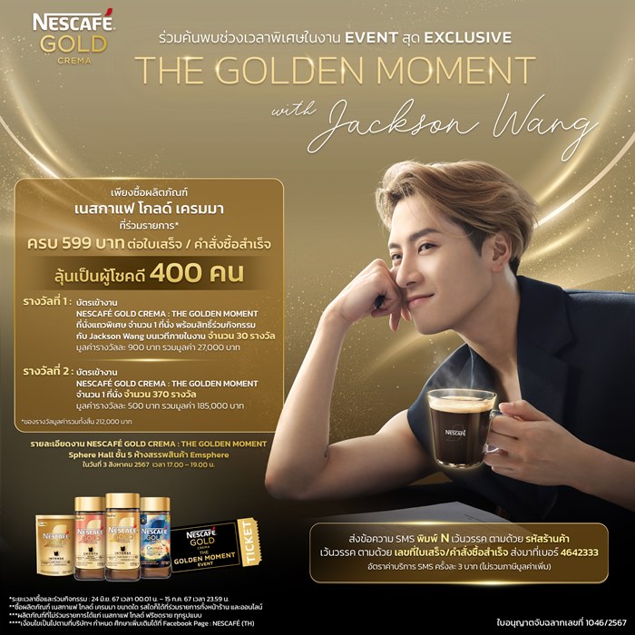 NESCAFÉ GOLD CREMA เชิญชวนคนรักกาแฟลุ้นรับสิทธิ์เข้าร่วมงาน NESCAFÉ GOLD CREMA : THE GOLDEN MOMENT with Jackson Wang สุดพิเศษแบบ Exclusive จำนวน 400 ท่าน แล้วมาร่วมค้นพบ GOLDEN MOMENT ของคุณไปด้วยกัน ห้ามพลาด!