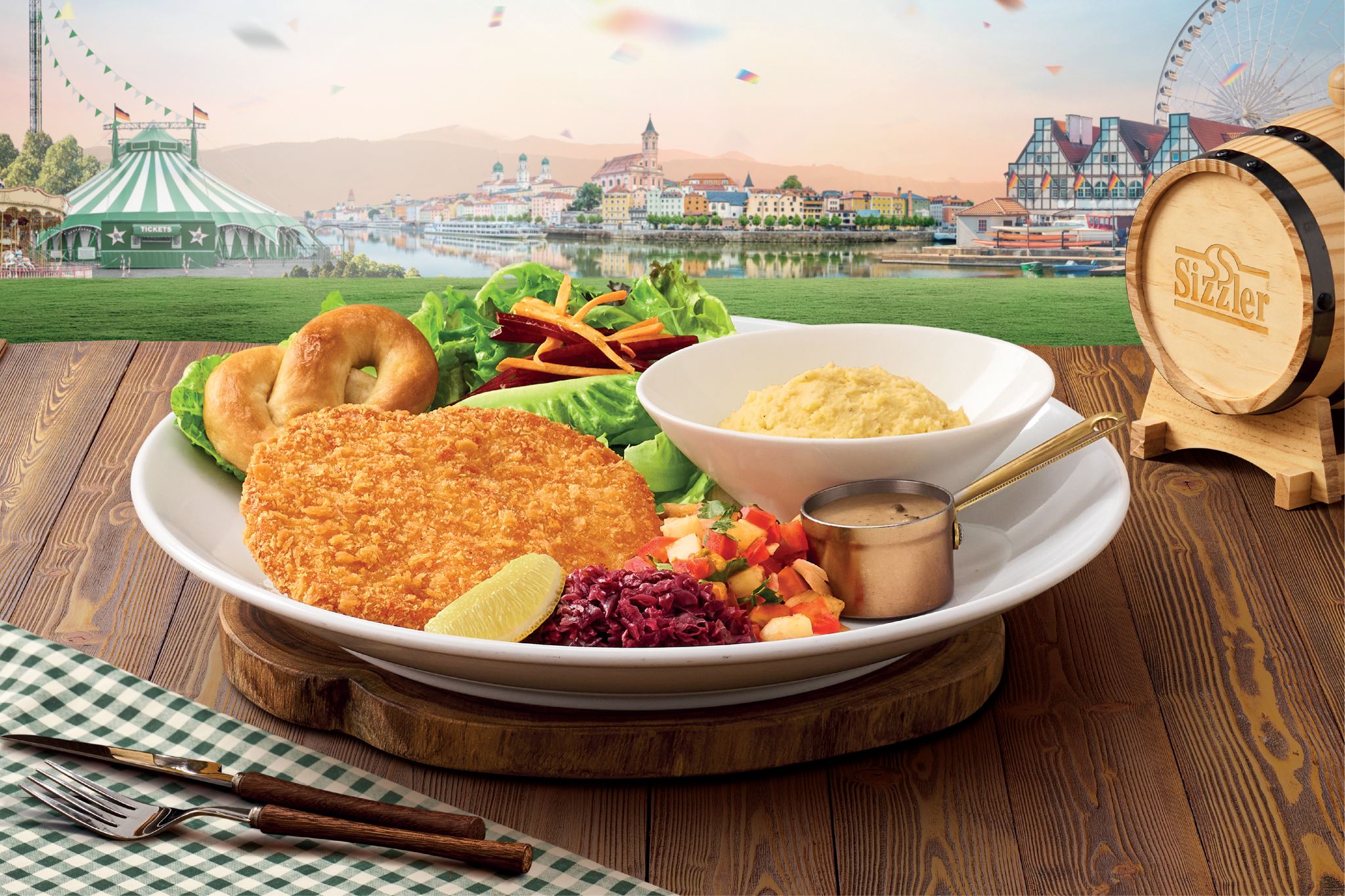 •หมูชุบเกล็ดขนมปังทอดสไตล์เยอรมันหรือเมนูชนิทเซิล (Schnitzel) ที่เป็นการนำเนื้อหมูคุณภาพเยี่ยมไปทุบจนได้ความนุ่มก่อนนำไปชุบเกล็ดขนมปังที่ปรุงรสพิเศษและทอดจนกรอบเป็นสีเหลืองทองพร้อมให้สัมผัสกรอบนอกแต่นุ่มชุ่มฉ่ำด้านในอย่างลงตัวเสริมความอร่อยด้วยซอสพริกไทยดำเสิร์ฟพร้อมเครื่องเคียงอย่างเพรทเซลหรือขนมปังขึ้นชื่อของประเทศเยอรมนีที่มีรูปร่างเป็นเอกลักษณ์เฉพาะตัวซาวร์เคร้าท์หรือกะหล่ำปลีดองสไปซี่ซัลซาสับปะรดมันบดและเลมอนฝานพร้อมสลัดบาร์ไม่อั้นจำนวน 1 ท่านในราคาเพียง 399 บาท (จากปกติ 549 บาท)