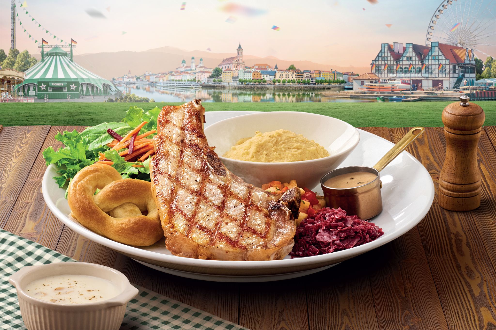 • สเต๊กพอร์คชอปสไตล์เยอรมันการผสมผสานระหว่างความอร่อยด้วยความเชี่ยวชาญด้านสเต๊กกับรสชาติแบบดั้งเดิมสไตล์เยอรมันด้วยชิ้นเนื้อหมูคุณภาพเยี่ยมชิ้นโตที่คัดสรรอย่างพิถีพิถันในความหนาแบบพอดีให้สัมผัสที่นุ่มและฉ่ำในทุกคำเสิร์ฟพร้อมซอสพริกไทยดำกลมกล่อมถึงใจทานคู่กับเครื่องเคียง อาทิ ขนมปังเพรทเซล กะหล่ำปลีดองสไปซี่ซัลซาสับปะรดและมันบดพร้อมสลัดบาร์ไม่อั้นจำนวน 1 ท่านในราคา 599 บาท (จากปกติ 749 บาท)