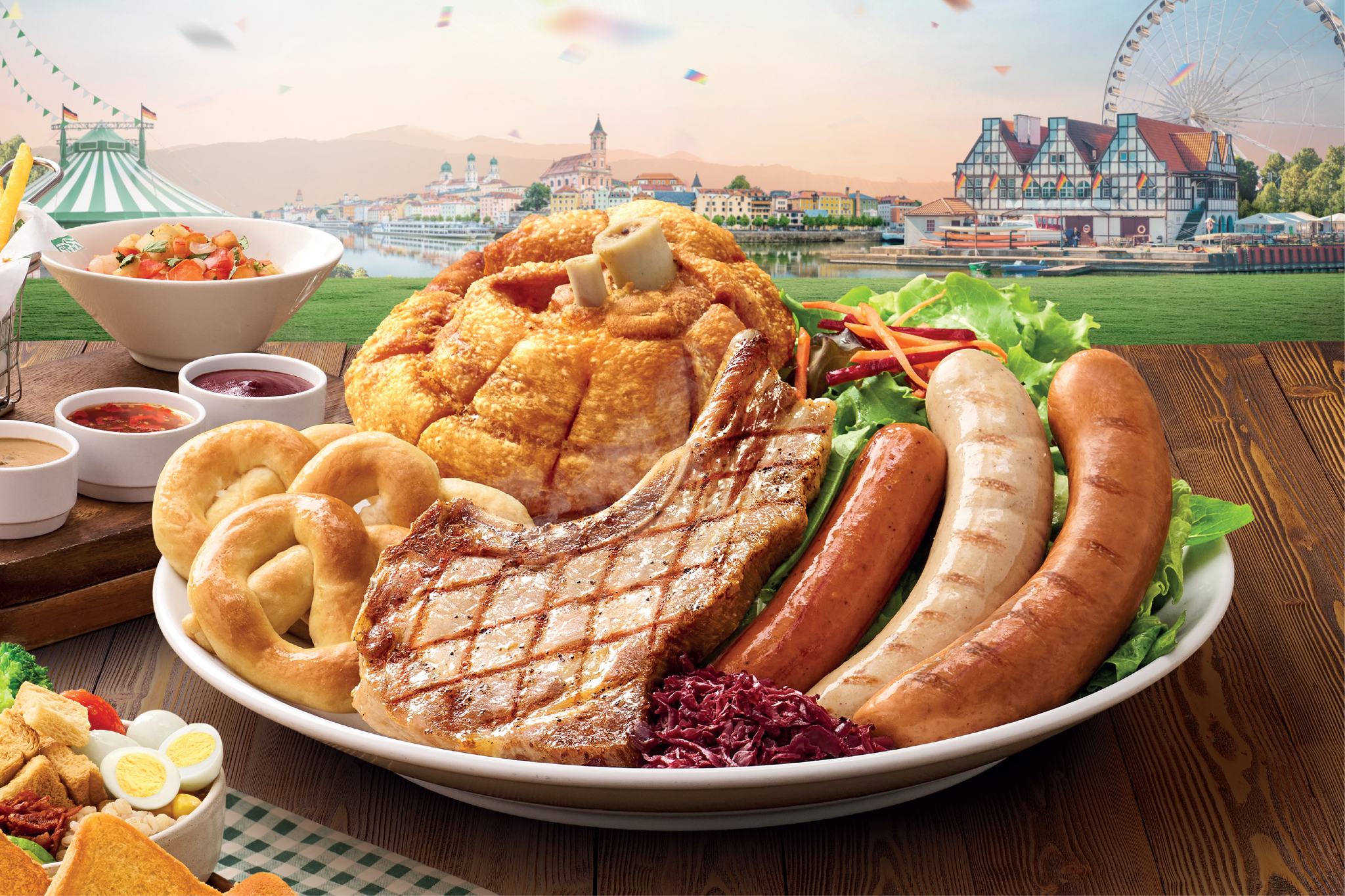 • สเต๊กพอร์คชอปขาหมูเยอรมันทอดและไส้กรอกรวมย่างสไตล์เยอรมันจานพิเศษเหมาะสำหรับสายปาร์ตี้ที่ควบรวมเอา 3 เมนูเด็ดมาไว้ในจานเดียวได้แก่สเต๊กพอร์คชอปชิ้นโตเนื้อนุ่มชุ่มฉ่ำย่างจนได้กลิ่นหอมมาพร้อมขาหมูเยอรมันทอดหนังกรอบเนื้อข้างในนุ่มละลายในปากหอมกลิ่นเครื่องเทศแบบเยอรมันทานคู่ไส้กรอกหลากชนิดที่แต่ละชิ้นมีรสชาติเฉพาะตัวย่างจนผิวนอกเกรียมหอมในขณะที่ด้านในยังคงความฉ่ำเสริมความอร่อยในสไตล์เยอรมันด้วยขนมปังเพรทเซลกะหล่ำปลีดองและผักสลัดเสิร์ฟคู่กับสไปซี่ซัลซาสับปะรดและซอส 3 สไตล์โดยมาพร้อมสลัดบาร์ไม่อั้นจำนวน 3 ท่านในราคา 1,299 บาท (จากปกติ 1,599 บาท)