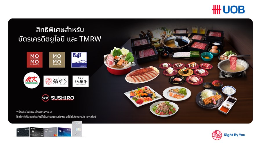 ธนาคารยูโอบี ประเทศไทย ผนึกกำลังกับ 7 ร้านอาหารสุดฮิต อาทิ Mo-Mo Paradise, Fuji, MK สุกี้, Nabezo Premium, Gyukatsu Kyoto Katsugyu และ Sushiro จัดแคมเปญพิเศษ ชวนเหล่านักชิม มาฟินทุกมื้อ อร่อยทุกวัน สำหรับลูกค้าบัตรเครดิตยูโอบี รับสิทธิพิเศษ ทั้งส่วนลด และเครดิตเงินคืนสูงสุดถึง 50% จัดเต็มสำหรับผู้ถือบัตรเครดิตยูโอบี เท่านั้น โดยลูกค้าธนาคารยูโอบีที่ถือบัตรเครดิตภายใต้แบรนด์ซิตี้สามารถเข้าร่วมโปรโมชันนี้ได้ และจำกัดจำนวนสิทธิ์รวมกัน