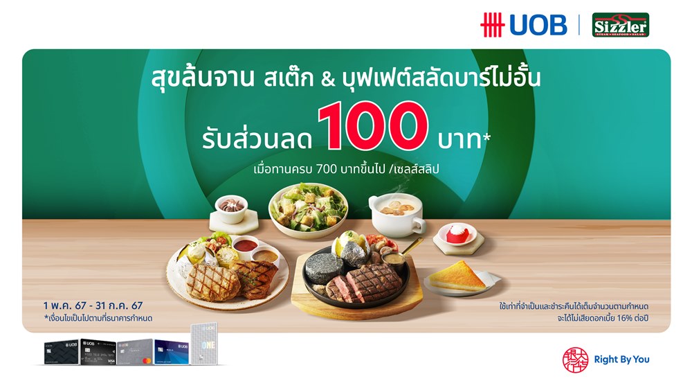 ธนาคารยูโอบี ประเทศไทย จับมือ ซิซซ์เล่อร์ (Sizzler) ร้านสเต๊กและสลัดบาร์ชื่อดังของไทย จัดโปรโมชันพิเศษ ชวนเหล่านักชิม สายกิน มาอร่อยสุดคุ้ม ทุกเมนูในร้านที่ Sizzler ทุกสาขา รับส่วนลด 100 บาท สำหรับลูกค้าบัตรเครดิต UOB เมื่อมียอดใช้จ่ายตั้งแต่ 700 บาทขึ้นไป ต่อเซลล์สลิป (หลังหักส่วนลดทุกประเภท และเฉพาะรับประทานที่ร้านเท่านั้น) ณ ร้านซิซซ์เล่อร์ ทุกสาขาทั่วประเทศ ระหว่างวันนี้ – 31 กรกฎาคม 2567 ชวนทุกคนมาร่วมอิ่มอร่อย สุดคุ้ม กับโปรโมชันสุดพิเศษ หลากหลายประเภทอาหารที่พร้อมตอบโจทย์ลูกค้าแล้ววันนี้