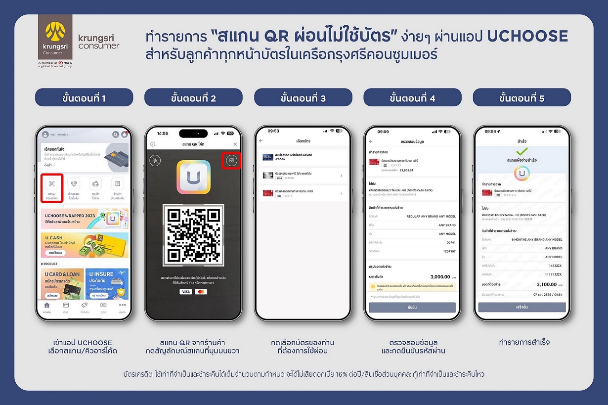 สมาชิกบัตรเครดิตและบัตรสินเชื่อในเครือกรุงศรี คอนซูมเมอร์ ที่สนใจใช้บริการ ‘สแกน QR ผ่อนไม่ใช้บัตร’ สามารถใช้บริการที่ร้านค้าพันธมิตรแบรนด์ชั้นนำที่ร่วมรายการกว่า 2,600 สาขา ได้ง่าย ๆ ผ่านแอปพลิเคชัน UCHOOSE เพียงกดไอคอน ‘สแกน/คิวอาร์โค้ด’ จากนั้นทำรายการสแกน QR ผ่อนชำระสินค้าจากร้านค้าพันธมิตร แล้วเลือกบัตรที่ต้องการทำรายการ จากนั้นตรวจสอบข้อมูล แล้วยืนยันรหัสผ่านก็จะเข้าสู่หน้าที่ทำรายการสำเร็จ สำหรับลูกค้าใหม่สามารถสมัครสินเชื่อดิจิทัล “เฟิร์สช้อยส์ เพย์พลัส” เพื่อใช้บริการ “สแกน QR ผ่อนไม่ใช้บัตร” ได้ที่ร้านค้าพันธมิตรหลัก อาทิ Power Buy, Telewiz by AIS, Banana IT, Kingkongphone, iStudio by SPVi, iStudio by Copperwired, .Life, TG Fone, Advice IT Infinite, J.I.B Computer, Mine By J.I.B, Big Camera ฯลฯ ทั้งนี้ ระยะเวลาโปรโมชันขึ้นอยู่กับร้านค้าผู้ให้บริการ กรุณาตรวจสอบเงื่อนไขเพิ่มเติม ณ จุดขาย สำหรับอัตราดอกเบี้ย รายละเอียดและเงื่อนไขอื่นให้เป็นไปตามที่บริษัทกำหนด ข้อมูลเพิ่มเติม https://bit.ly/firstchoice-payplus