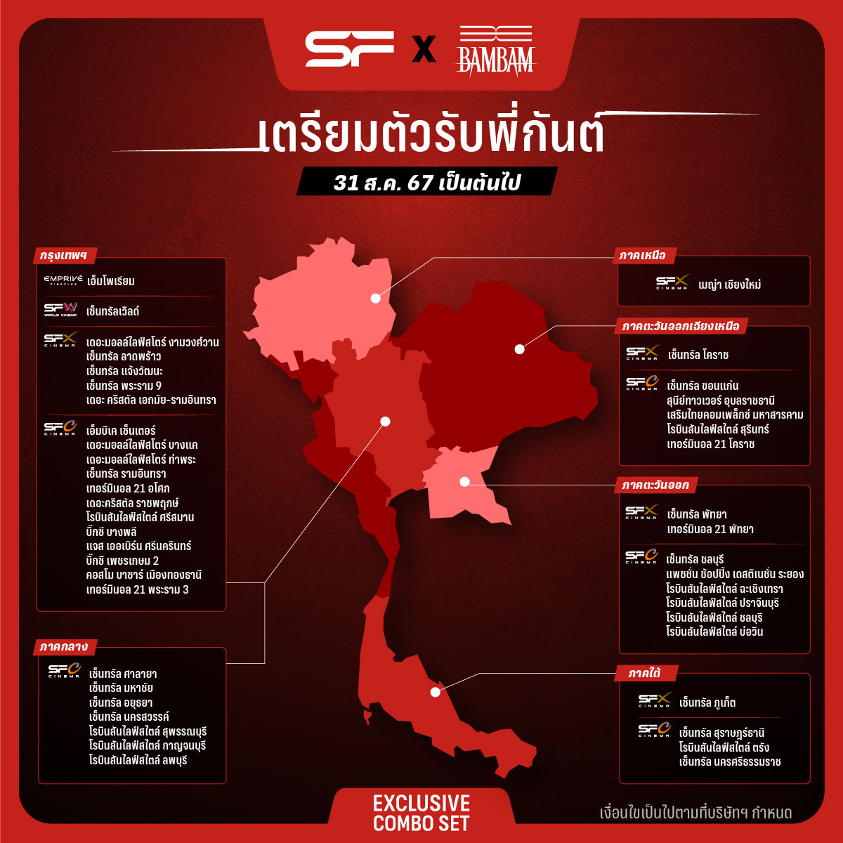 “SF x BAMBAM EXCLUSIVE COMBO SET” ถือเป็นครั้งแรกของโลกกับชุดคอมโบลิขสิทธิ์แท้ ที่ได้แรงบันดาลใจจากมินิอัลบั้มล่าสุดของ “แบมแบม” มีให้สะสม 2 แบบ ในราคา 699 บาท แต่ละชุดประกอบด้วย SUPER GIANT BUCKET ถังป๊อปคอร์นไซซ์ยักษ์ขนาด 380 ออนซ์ พร้อมป๊อปคอร์น DOUBLE WALL CUP แก้วน้ำขนาด 22 ออนซ์ พร้อมเครื่องดื่ม และ SF COLLECTIBLE TICKET