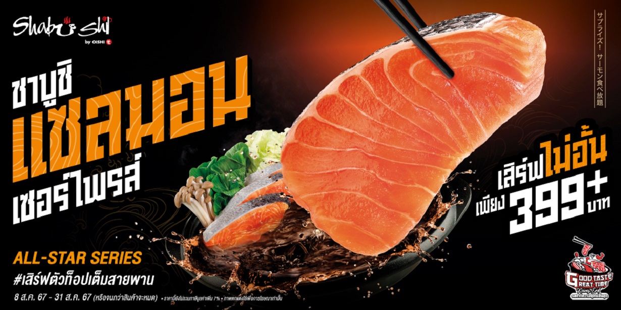 ชาบูชิ (Shabushi) จัดเซอร์ไพรส์ เปิดโปรฯ สุดปัง Shabushi ALL-STAR SERIES #เสิร์ฟตัวท็อปเต็มสายพาน ยกขบวนวัตถุดิบชั้นยอดที่ได้รับความนิยมและเป็นที่ชื่นชอบของนักกิน สายชาบู – ชาบู มาให้บริการเป็นพิเศษเพิ่มเติมอย่างต่อเนื่อง ล่าสุด พลาดไม่ได้กับหนึ่งในเมนูตัวท็อป “เนื้อปลาแซลมอน” ชิ้นโต…เต็มปากเต็มคำ เสิร์ฟไม่อั้นบนสายพานแบบไม่มีค่าใช้จ่ายเพิ่มเติม และยังอร่อยได้เต็มที่กับน้ำซุปหลากสไตล์ เลือกได้ตามชอบ ไม่ว่าจะเป็น ชาบู – ชาบูซุป น้ำซุปน้ำใส, คุโรซุป น้ำซุปน้ำดำ, หรือ น้ำซุปน้ำต้มยำ รสชาติจัดจ้าน พร้อมเมนูปกติอื่น ๆ อาทิ เนื้อเซอร์ลอยด์, เนื้อฮารามิ, หมูสไลซ์, เบคอน, กุ้ง, หมึก, และอีกมากมายล้นสายพาน ทั้งซูชิและอาหารรับประทานเล่นสไตล์ญี่ปุ่น รวมแล้วกว่า 80 รายการ ในราคาเริ่มต้นเพียงคนละ 399 บาท+* (รวมเครื่องดื่ม, ผลไม้, และ ไอศกรีม) ที่ ชาบูชิ ทุกสาขา ตั้งแต่ 8 – 31 สิงหาคม 2567 หรือจนกว่าสินค้าจะหมด
