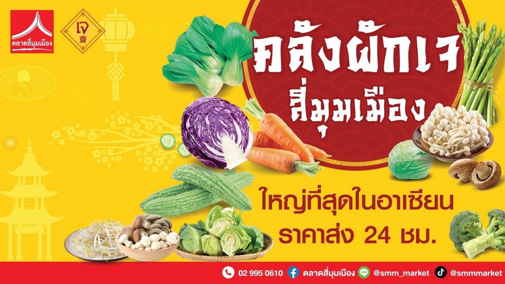 คุณปณาลี ภัทรประสิทธิ์ ผู้ช่วยกรรมการผู้จัดการ กลุ่มงานกลยุทธ์ธุรกิจ ตลาดสี่มุมเมือง กล่าวว่า “ในช่วงเทศกาลกินเจ ผักสดและสินค้าที่ทำจากพืชจะมีความต้องการเพิ่มขึ้น ทั้งจากกลุ่มผู้ประกอบการ ได้แก่ ร้านอาหาร รถเร่ ตลาดสด ตลาดนัด และกลุ่มผู้ที่ถือศีลกินเจเป็นประจำทุกปี ตลาดฯ มีเกษตรกรนำผักผลไม้สดจากสวนเข้ามาจำหน่ายกว่า 8,000 ตันต่อวัน ดังนั้น ที่นี่จึงถือเป็น คลังผักเจ ที่ใหญ่ที่สุดในประเทศและราคาถูกที่สุดในประเทศ เพราะเป็นต้นทางการกระจายสินค้าไปยังที่ต่าง ๆ สำหรับผักยอดนิยมที่ขายดีในช่วงเทศกาลกินเจ ประกอบด้วย กะหล่ำปลี ผักกาดขาว มะเขือเทศท้อ มะระ ผักบุ้งจีน แตงร้าน ผักกาดหอม เห็ดหอม ถั่วงอก คะน้า ซึ่งเป็นผลผลิตจากเกษตรกรที่ผ่านมาตรฐานคุณภาพ ปลอดภัยจากสารตกค้าง เนื่องจากตลาดสี่มุมเมือง มีการสุ่มตรวจสารพิษทุกวัน วันละ 300 ชนิด ซึ่งแล็บได้รับการรับรองมาตรฐานจากกรมวิทยาศาสตร์การแพทย์ กระทรวงสาธารณสุข เพื่อรักษามาตรฐานและคุณภาพ ความปลอดภัยในสินค้าตั้งแต่ต้นน้ำไปจนถึงปลายน้ำให้แก่ผู้บริโภค ดังนั้น ผู้ซื้อสามารถมั่นใจได้ว่า หากมาซื้อผักผลไม้ที่ตลาดสี่มุมเมือง จะได้รับสินค้าสดใหม่ มีคุณภาพและปลอดภัย นอกจากนี้ ปัจจุบัน ตลาดสี่มุมเมือง เพิ่มช่องทางการสั่งสินค้าทางออนไลน์ผ่าน www.simummuangonline.com เพื่อให้ผู้ซื้อสะดวกมากขึ้น สามารถซื้อสินค้าที่สด คุณภาพดี ราคาส่งเหมือนมาเลือกซื้อด้วยตัวเอง”