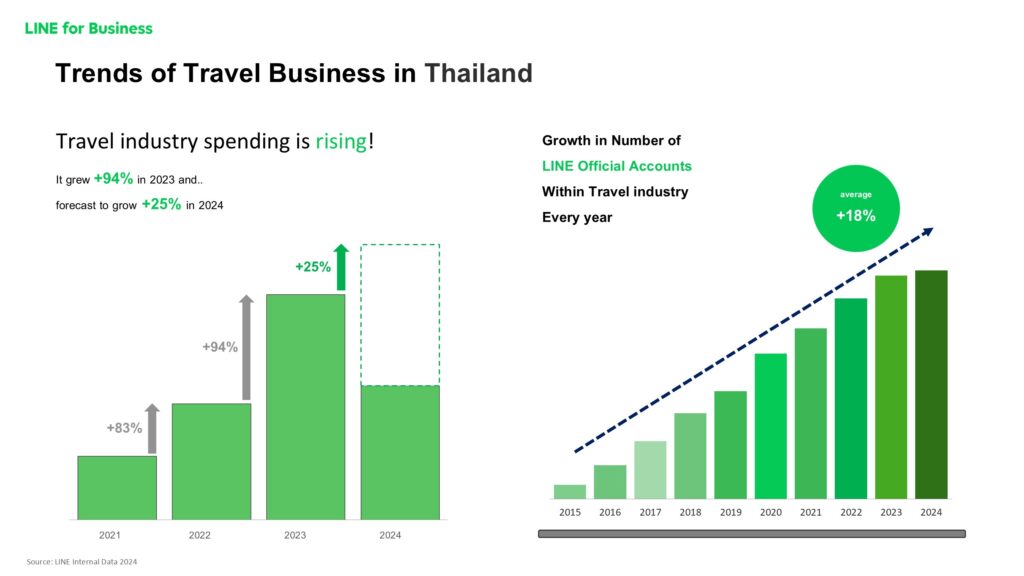 ด้วยเหตุนี้ LINE จึงมองว่าการนำ ‘เทคโนโลยี’ มาผสานกับ ‘บริการ’ จะช่วยแก้ปัญหาทั้งในเชิงแรงงานและประสิทธิภาพ ยกระดับประสบการณ์การท่องเที่ยวให้ตอบโจทย์นักท่องเที่ยวได้หลากหลาย ช่วยผ่อนคลายปัญหาการให้บริการที่ล้นมือบุคลากรได้อย่างลงตัว นั่นทำให้สถานการณ์ที่ผ่านมา บริการ LINE for Business มีจำนวนผู้ใช้บริการในกลุ่มอุตสาหกรรมท่องเที่ยวเติบโตมากถึง 94% ในปี 2022 – 2023 และคาดการณ์ว่า 2023 -2024 จะเติบโตต่อเนื่องที่ 25%