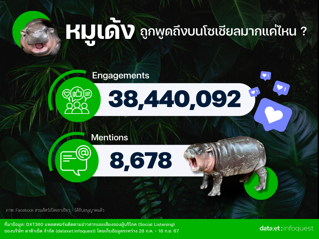 จากกระแสไวรัลของ “หมูเด้ง” บริษัท ดาต้าเซ็ต จำกัด ได้นำเครื่องมือ DXT360 เพื่อฟังเสียงในสังคมออนไลน์ (Social Listening) ระหว่างวันที่ 28 กรกฎาคม – 18 กันยายน 2567 เพื่อนำข้อมูลมาวิเคราะห์ พบว่าบนโซเชียลมีเดียมีการพูดถึง (Mention) “หมูเด้ง” 8,678 ครั้ง และได้รับการมีส่วนร่วม หรือเอ็นเกจเมนต์ (Engagement) รวม 38,440,092 ครั้ง โดยแพลตฟอร์ม Facebook เป็นช่องทางที่ได้รับการพูดถึง (Mention) มากที่สุดจำนวน 5,263 ครั้ง และแพลตฟอร์ม TikTok ได้รับเอ็นเกจเมนต์ (Engagement) สูงที่สุด 34,674,750 ครั้ง