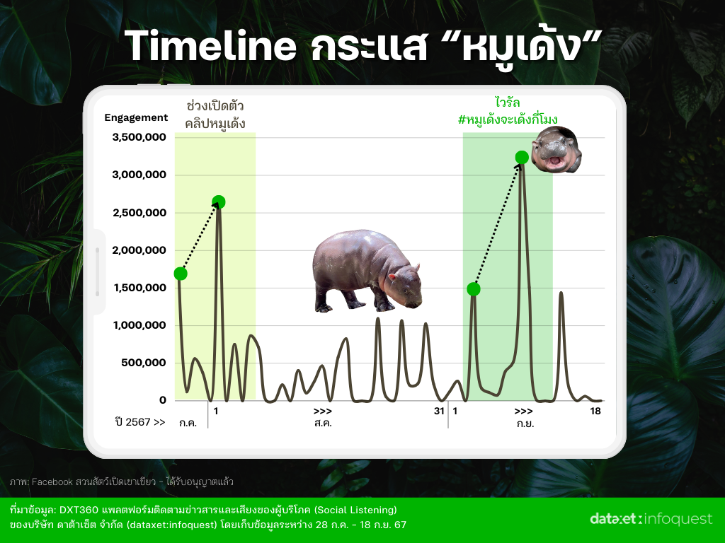 ไทม์ไลน์ความดังของ “หมูเด้ง” ฮิปโปแคระจากสวนสัตว์เปิดเขาเขียวมีจุดเริ่มต้นที่น่าสนใจจากแพลตฟอร์ม TikTok ผ่านบัญชีชื่อ “ขาหมู แอนด์เดอะแก๊ง” (@khamoo.andthegang) โดยมีการเปิดตัวคลิปแรกของหมูเด้งในช่วงปลายเดือนกรกฎาคม 2567 ซึ่งได้รับความสนใจมาก แม้ว่าในระยะแรกค่า Engagement จะค่อนข้างคงที่ แต่จุดพลิกผันสำคัญเกิดขึ้นเมื่อมีการใช้แฮชแท็ก #หมูเด้งจะเด้งกี่โมง จนเกิดไวรัล