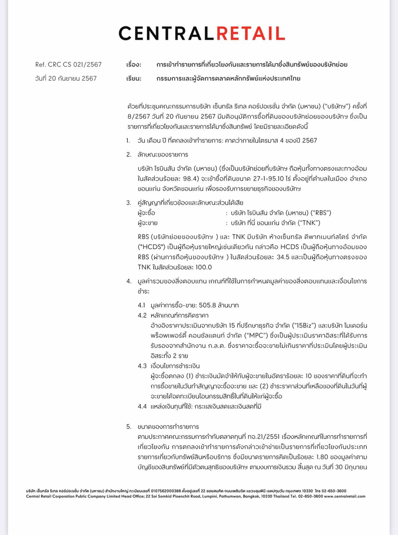 สำหรับที่ดินผืนดังกล่าว ตั้งอยู่ ตำบลในเมือง อำเภอขอนแก่น จังหวัดขอนแก่น โดยเบื้องต้นทาง บริษัท โรบินสัน จำกัด (มหาชน) (RBS) ซึ่งเป็นบริษัทย่อยที่บริษัทถือหุ้นทั้งทางตรงและทางอ้อมในสัดส่วน 98.4% จะเข้าซื้อที่ดินขนาด 27-1-95.10 ไร่ มีเป้าหมายเพื่อรองรับการขยายธุรกิจของบริษัท