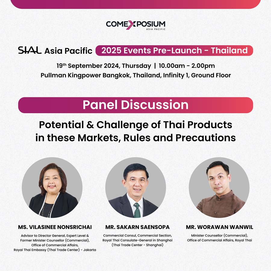 โปรโมซาลงส์/หอการค้าฝรั่งเศส-ไทย ในฐานะตัวแทน COMEXPOSIUM ผู้จัดงานแสดงสินค้าอาหารและเครื่องดื่มระดับโลกในเครือข่าย SIAL Network ขอเชิญชวนผู้ประกอบการและนักธุรกิจนำเข้า/ส่งออกสินค้าอาหารและเครื่องดื่มตลอดจนผู้ที่สนใจเข้าร่วมงาน SIAL Asia Pacific 2025 Events Pre-Launch เพื่อรับฟังข้อมูลงานแสดงสินค้าโดยเฉพาะงาน SIAL China 2025 (Shanghai, Shenzhen), Food & Drinks Malaysia by SIAL 2025 และ SIAL InterFOOD Indonesia 2025
