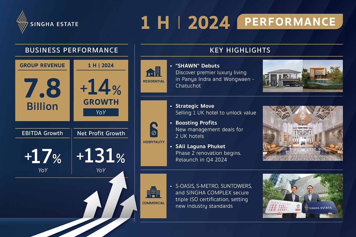 ด้านคุณฐิติมา รุ่งขวัญศิริโรจน์ ประธานเจ้าหน้าที่บริหาร บริษัท สิงห์ เอสเตท จำกัด (มหาชน) หรือ ‘S’ เปิดเผยว่า “เราพอใจกับการเติบโตของรายได้และพลิกฟื้นผลกำไรสำหรับผลประกอบการในช่วงครึ่งปีแรกนี้ แม้ว่าจะถูกกดดันจากปัจจัยฤดูกาล และต้องเผชิญกับความท้าทายของเศรษฐกิจ และภาวะอุตสาหกรรมก็ตาม นี่สะท้อนให้เห็นถึงคุณภาพ ความแข็งแกร่ง และกระจายตัวที่ดีของพอร์ตโฟลิโอของบริษัทฯ รวมถึงกลยุทธ์การตลาดเชิงรุกแบบเฉพาะเจาะจง เพื่อให้เราสามารถเข้าถึงตลาดศักยภาพที่มีความแข็งแกร่งด้านกำลังซื้ออยู่เสมอ ควบคู่ไปกับการยกระดับผลิตภัณฑ์และรังสรรค์บริการที่เหนือระดับ ออกแบบมารองรับความต้องการของผู้บริโภคในระดับกลาง-บน เพื่อให้เราสามารถบรรลุกลยุทธ์การตั้งราคาที่มีประสิทธิภาพได้ ดังนั้น เรามีความมั่นใจว่า เมื่อเข้าสู่ช่วงพีคของการดำเนินงานแล้ว ทุกพอร์ตโฟลิโอของเราได้ทำงานเต็มที่ จะผลักดันให้ผลประกอบการในช่วงครึ่งปีหลังของปี 2567 เติบโตอย่างโดดเด่น”