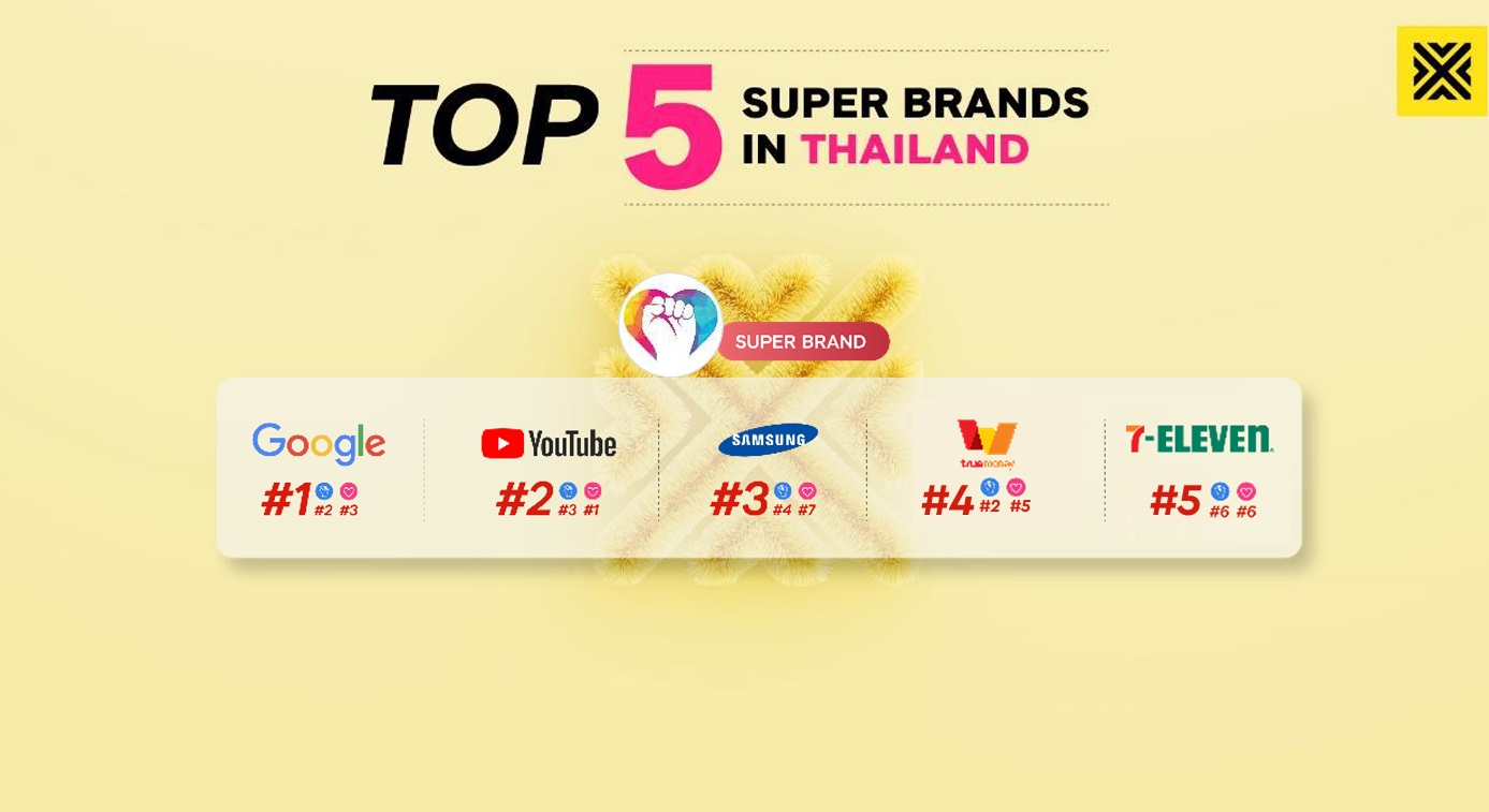 สำหรับผลการสำรวจวิจัยล่าสุดในปีนี้ของประเทศไทยพบว่า Super Brands ที่ทรงพลังและเป็นที่รักในใจคนไทย 5 อันดับ คือ Google, YouTube, Samsung, TrueMoney และ 7-11