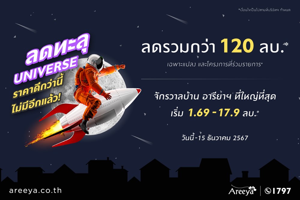 บริษัท อารียา พรอพเพอร์ตี้ จำกัด (มหาชน) ผู้พัฒนาอสังหาริมทรัพย์ ที่มุ่งเน้นตอบโจทย์ไลฟ์สไตล์ที่หลากหลายของผู้คน หรือ “Lifestyle Property Developer” มอบโปรโมชันจัดหนักส่งท้ายปี! ‘ลดทะลุ UNIVERSE’ กับส่วนลดรวมกว่า 120 ล้านบาท* บนทำเลที่ดีที่สุด รวม 13 โครงการคุณภาพ พร้อมข้อเสนอสุดพิเศษให้คุณได้เลือกรับอีกมากมาย อาทิ อารียาฯ ช่วยผ่อนสูงสุด 1 ปี*, ฟรี! ค่าส่วนกลาง สูงสุดนาน 10 ปี*, บัตรกำนัล มูลค่าสูงสุด 200,000 บาท* และของแถมอีกหลายรายการ สำหรับลูกค้าที่จอง บ้าน และทาวน์โฮม สร้างเสร็จพร้อมอยู่ ในโซน บางนา, โซนรามอินทรา – หทัยราษฎร์, โซนวงแหวน – ลำลูกกา และโซนบางบัวทอง – 340 ในราคาเริ่มต้น 1.69 – 17.9 ล้านบาท* ตั้งแต่วันนี้ – 15 ธันวาคมนี้ เท่านั้น!!