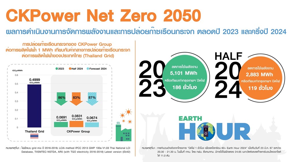 นายธนวัฒน์ ตรีวิศวเวทย์ กรรมการผู้จัดการ บมจ. ซีเค พาวเวอร์ กล่าวว่า เรามีความมุ่งมั่นในการเดินหน้าสู่เป้าหมายตามแผนงาน CKP NET ZERO EMISSIONS 2050 เพื่อมุ่งสู่การเป็นองค์กรที่สามารถปล่อยก๊าซเรือนกระจกสุทธิเป็นศูนย์ภายในปี 2593 โดยการดำเนินงานที่สำคัญที่ทำให้ ซีเค พาวเวอร์ บรรลุเป้าหมาย คือ การเพิ่มประสิทธิภาพกระบวนการผลิตไฟฟ้า บริษัทได้วางแผนระยะยาวโดยมุ่งเน้นขยายการลงทุนในโครงการที่ช่วยลดการปล่อยก๊าซเรือนกระจก เช่น การศึกษาการผลิตไฟฟ้าจากเชื้อเพลิงไฮโดรเจนผสมก๊าซธรรมชาติในโรงไฟฟ้าพลังความร้อนร่วม สอดรับกับการเปลี่ยนผ่านด้านพลังงานของไทยตามร่างแผนพัฒนากำลังผลิตไฟฟ้าของประเทศไทย พ.ศ. 2567 – 2580 (PDP2024) และ 6 เดือนแรกในปี 2567 บริษัทสามารถเพิ่มประสิทธิภาพการใช้พลังงานในการผลิตไฟฟ้าได้ดีกว่าเป้าหมาย 0.86% นอกจากการบริหารจัดการการปล่อยก๊าซเรือนกระจกและการพัฒนาปรับปรุงประสิทธิภาพการผลิตไฟฟ้าแล้ว บริษัทได้มีการปรับใช้ไฟฟ้าจากพลังงานหมุนเวียนภายในองค์กรเพิ่มขึ้น เช่น การเปลี่ยนมาใช้รถที่ใช้พลังงานไฟฟ้าและรถไฮบริดในการขนส่งภายในสำนักงานและโรงไฟฟ้าในเครือฯ