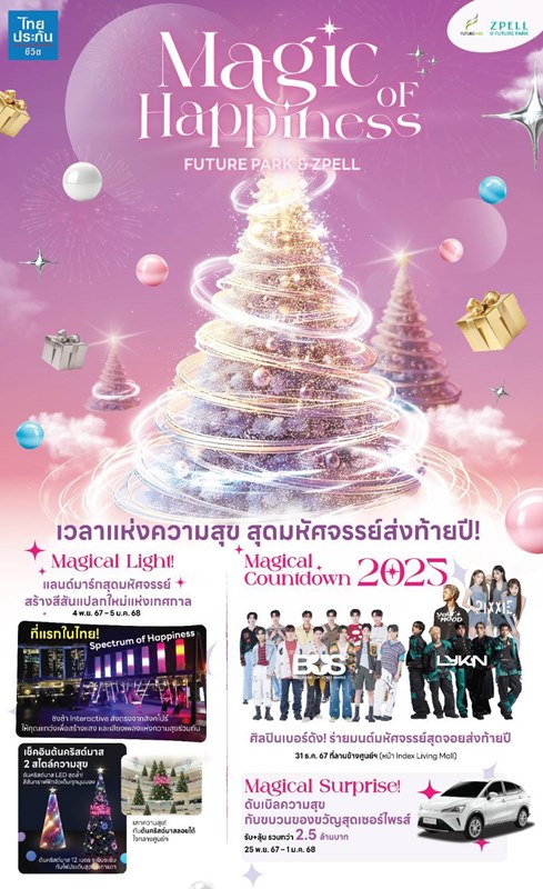 ศูนย์การค้าฟิวเจอร์พาร์คและสเปลล์ ร่วมฉลองเทศกาลแห่งความสุขส่งท้ายปี มอบประสบการณ์สุดพิเศษในงาน “Magic of Happiness” เนรมิตบรรยากาศให้เต็มไปด้วยแสงสีเสียงอันตระการตา จุดถ่ายรูปเช็คอินสุดอลังการ พร้อมอัดแน่นด้วยกิจกรรมสุดฟิน และจัดเต็มด้วยโปรโมชั่นสุดเซอร์ไพรส์มากมาย ตั้งแต่วันนี้ถึง 5 มกราคม 2568