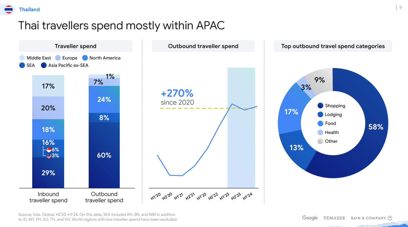 โดย 45% ของการใช้จ่ายสำหรับการท่องเที่ยวในไทยมาจากกลุ่มนักท่องเที่ยวในภูมิภาคเอเชียแปซิฟิก ในขณะที่ค่าใช้จ่ายในการเดินทางไปต่างประเทศของนักท่องเที่ยวชาวไทยพุ่งสูงขึ้นถึง 270% นับตั้งแต่ปี 2563 โดยนักท่องเที่ยวชาวไทยเกือบ 70% ใช้จ่ายในภูมิภาคเอเชียแปซิฟิก