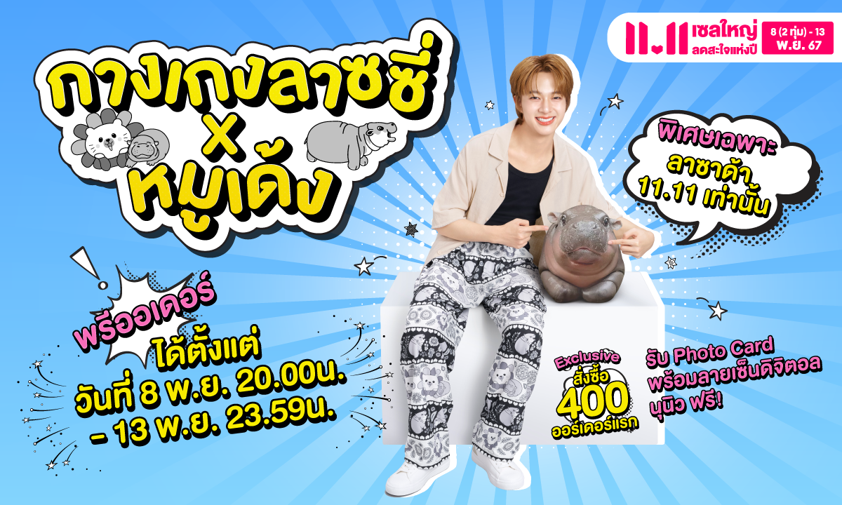 ลาซาด้า จับมือองค์การสวนสัตว์แห่งประเทศไทยฯ เปิดตัวกางเกงคอลเล็กชันพิเศษ “ลาซซี่ X หมูเด้ง” รับแคมเปญ 11.11 เซลใหญ่ ลดสะใจแห่งปี โดยกางเกงคอลเล็กชันพิเศษนี้เป็นสินค้าพรีเมียมลิขสิทธิ์อย่างเป็นทางการ และจะนำรายได้หลังหักค่าใช้จ่ายส่วนหนึ่งร่วมบริจาคสมทบทุนให้กับ “โครงการหมูเด้ง ชวนช่วยผู้ประสบอุทกภัยและดูแลสวัสดิภาพเพื่อนสัตว์” ขององค์การสวนสัตว์แห่งประเทศไทยฯ พร้อมพรีออร์เดอร์เฉพาะที่ลาซาด้า 8 พ.ย. นี้ 2 ทุ่ม
