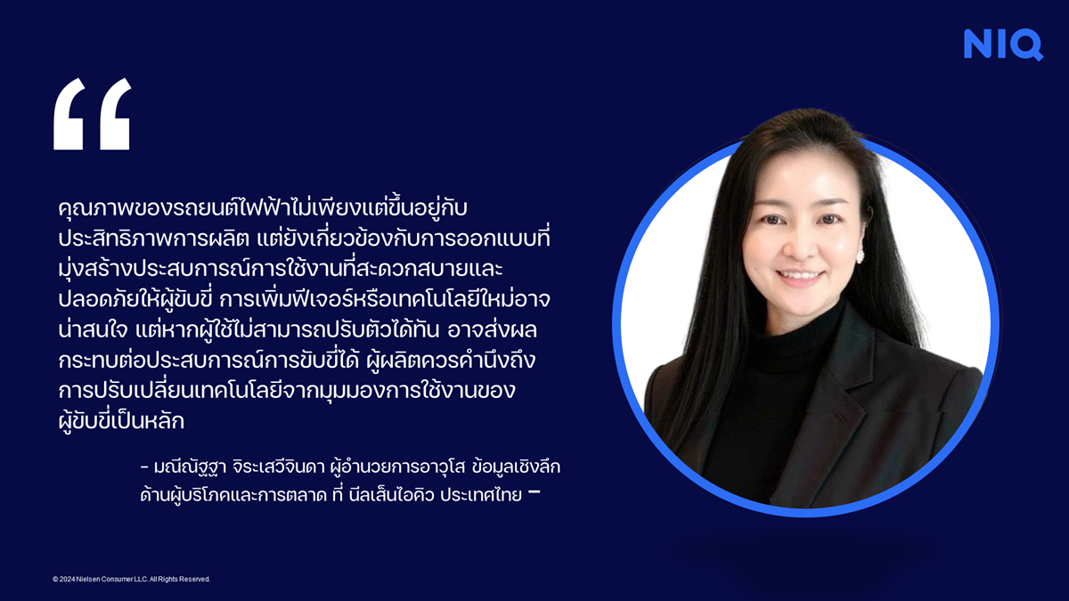 คุณมณีณัฐฐา จิระเสวีจินดา ผู้อำนวยการอาวุโส ข้อมูลเชิงลึกด้านผู้บริโภคและการตลาด นีลเส็นไอคิว ประเทศไทย กล่าวว่าคุณภาพของรถยนต์ไม่เพียงแต่ขึ้นอยู่กับประสิทธิภาพการผลิต แต่ยังเกี่ยวข้องกับการออกแบบที่มุ่งสร้างประสบการณ์การใช้งานที่สะดวกสบายและปลอดภัยให้ผู้ขับขี่ด้วย