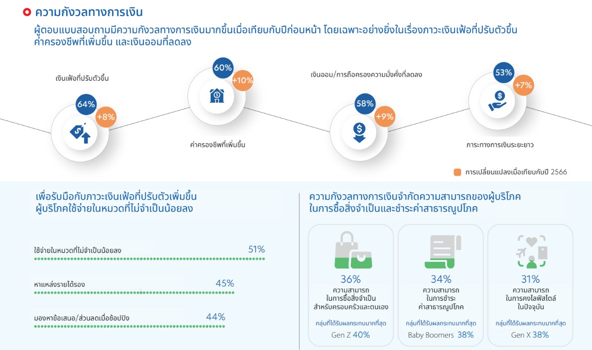 คนไทย 42%ใช้จ่ายกับสิ่งของจำเป็นมากขึ้น โดยการซื้อสินค้าแบรนด์เนมลดลง (9%) หมวดไอที Gadget จิวเวลรี่ (5%) แต่หมวดที่ลดลงน้อยมากคือ หมวดบิวตี้ (2%) ขณะที่เทรนด์ใช้จ่ายของ Gen Z (56%) และ Gen Y (45%) โฟกัสกับการซื้อประสบการณ์และสนใจลงทุนเพิ่มขึ้น เช่น การเดินทาง รับประทานร้านอาหารรสเลิศ คอนเสิร์ต อิเวนต์ งานเทศกาล