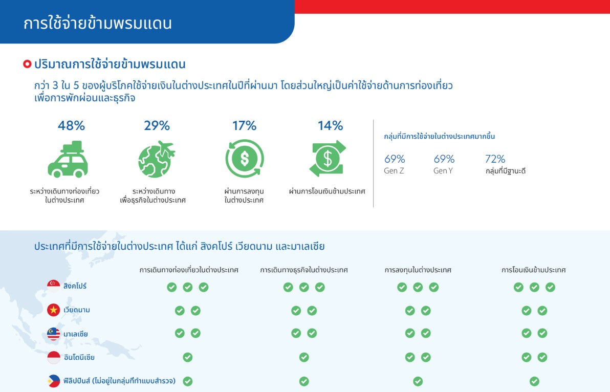 แม้คนไทยจะระมัดระวังกับการใช้จ่าย กว่า 58% ยังคงใช้จ่ายกับการเดินทางต่างประเทศในปีที่ผ่านมา โดยมี Destination ที่มาแรงในอาเซียน เช่น สิงคโปร์ เวียดนาม มาเลเซีย และ Destination อื่นๆ ทั่วโลกได้แก่ ญี่ปุ่น จีน (รวมฮ่องกง) ฝรั่งเศส ผ่านบัตรเครดิตในต่างประเทศเพิ่มขึ้น 5% เมื่อเทียบการใช้จ่ายบัตรเครดิตในต่างประเทศเป็นรายปีของผู้ถือบัตรเครดิตยูโอบี วีซ่า (ระหว่าง 1 ก.ค. 66 – 30 มิ.ย. 67) โดยเป็นการเดินทางท่องเที่ยวเพื่อประสบการณ์ถึง 48% การเดินทางเพื่อธุรกิจ 29%