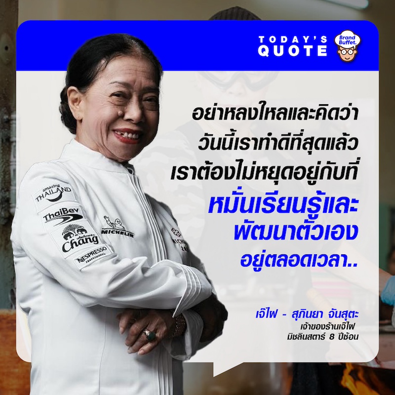ถึงแม้ว่าปัจจุบันจะมีร้านอาหารริมทาง หรือ สตรีทฟู้ด (Street Food) น้องใหม่เกิดขึ้นมากมาย แต่ชื่อของ “เจ๊ไฝ” หรือ “สุภินยา จันสุตะ” เจ้าแม่ไข่เจียวปู ก็ยังเป็น Street Food ที่อยู่ในใจนักกินชาวไทยและต่างชาติ ไม่ว่าเวลาจะผ่านไปอย่างไร ยังคงมีนักชิมแวะเวียนเข้ามาลิ้มรสอยู่เสมอ โดยเฉพาะเมนูสุดดัง “ไข่เจียวปู” จนล่าสุดครอง 1 ดาวมิชลินสตาร์ (Michelin Stars) ได้ต่อเนื่องเป็นปีที่ 8 ทั้งยังซุ่มพัฒนาซอสออกมาทำตลาดอีกด้วย แล้วทำไมเจ๊ไฝถึงสนใจมาทำซอสล่ะ ตามมาฟังไอเดียจากปากของ “เจ๊ไฝ” พร้อมเคล็ดลับการทำร้านอาหารให้ประสบความสำเร็จมาถึงทุกวันนี้