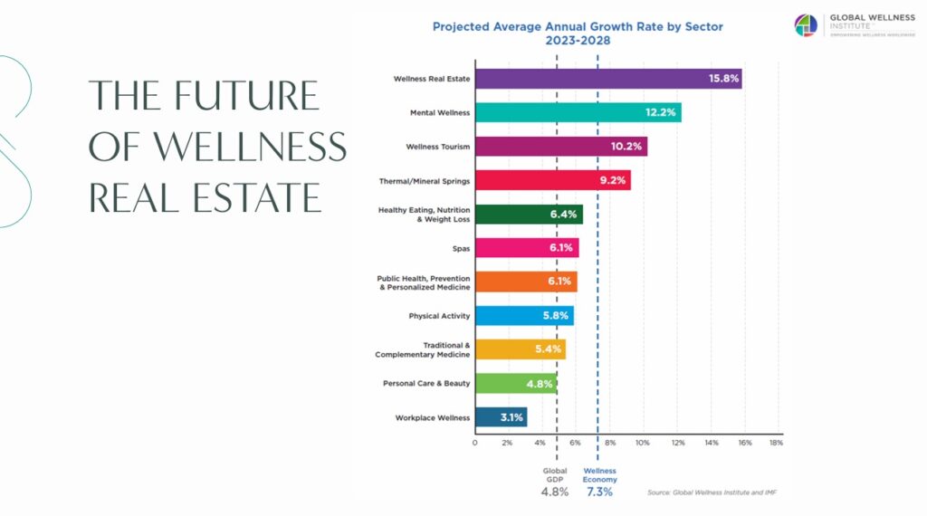 ที่น่าสนใจคือ ตลาด Wellness Developer มีโอกาสเติบโตสูงถึง 15.8% แม้ว่าปัจจุบันตลาดยังเล็กมาก ทั่วโลกมีสัดส่วนแค่ 6% ส่วนในไทยมีสัดส่วนเพียง 1.3% เท่านั้น แต่คุณภูมิพัฒน์ บอกว่า ในช่วง 3 ปีที่ผ่านมา (ปี 2023-2028) ตลาด Wellness Developer เติบโตถึง 10% ซึ่งถือว่าสูงมาก เมื่อเทียบกับตลาดก่อสร้างที่มีการเติบโตเพียง 0.8% และคาดว่าจะเติบโตต่อเนื่อง