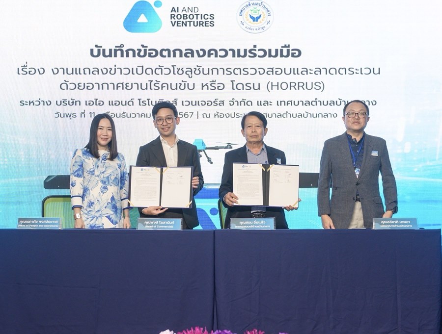 บริษัท เอไอ แอนด์ โรโบติกส์ เวนเจอร์ส จำกัด หรือ เออาร์วี (ARV) ผู้เชี่ยวชาญเทคโนโลยีปัญญาประดิษฐ์และหุ่นยนต์ ผนึกกำลังกับ เทศบาลตำบลบ้านกลาง อำเภอเมืองลำพูน จังหวัดลำพูน ร่วมลงนามบันทึกข้อตกลงความร่วมมือ (MOU) ว่าด้วยเรื่อง การพัฒนาโซลูชันการตรวจสอบและลาดตระเวนด้วยอากาศยานไร้คนขับอัตโนมัติ HORRUS เพื่อยกระดับความปลอดภัยและคุณภาพชีวิตของประชาชนในพื้นที่ภาคเหนือตอนกลางและตอนล่างได้อย่างยั่งยืน ณ ห้องประชุมศาลาประชาคม เทศบาลตำบลบ้านกลาง จังหวัดลำพูน