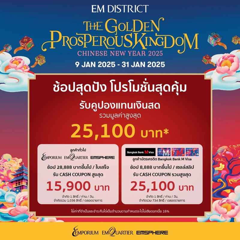ร่วมช้อปไอเท็มเสริมความปังและอิ่มอร่อยกับเมนูอาหารมงคลฉลองตรุษจีนปีงูสุดยิ่งใหญ่ ได้ที่งาน “EM DISTRIC THE GOLDEN PROSPEROUS KINGDOM CHINESE NEW YEAR 2025” พร้อมรับโปรโมชั่นและสิทธิประโยชน์สุดพิเศษได้ที่ ศูนย์การค้าเอ็มโพเรียม เอ็มควอเทียร์ และเอ็มสเฟียร์ ตั้งแต่วันนี้ – 31 มกราคม 2568