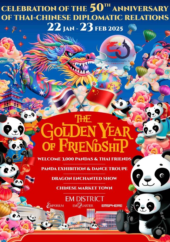 ร่วมสัมผัสปรากฏการณ์ฉลองตรุษจีนปีมะเส็งสุดยิ่งใหญ่ ในวาระครบรอบ 50 ปี ความสัมพันธ์การทูตไทย – จีน ในงาน “EM DISTRICT THE GOLDEN YEAR OF FRIENDSHIP” ตั้งแต่วันที่ 22 มกราคม – 28 กุมภาพันธ์ 2568 ที่ เอ็ม ดิสทริค