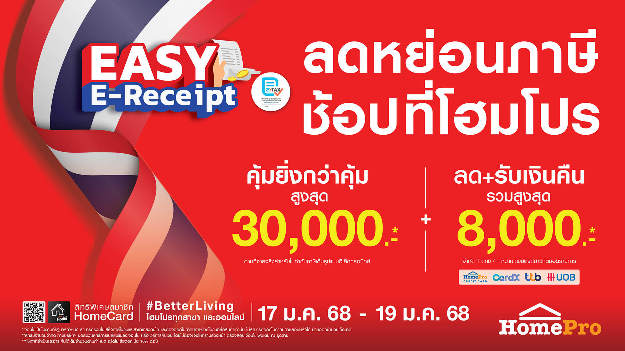 โฮมโปร ร่วมสนับสนุนมาตรการช้อปลดหย่อนภาษี เปิดตัวแคมเปญ HomePro Easy E-Receipt มอบความสนุก ช้อปคุ้มค่ารับต้นปีใหม่ และตรุษจีน ให้ผู้บริโภค 2 ต่อ! รับสิทธิ์ลดหย่อนภาษี สูงสุด 30,000 บาท (ตามที่จ่ายจริงสำหรับใบกำกับภาษีเต็มรูปแบบอิเล็กทรอนิกส์) พร้อมมอบความพิเศษเฉพาะสมาชิกโฮมการ์ด และเอกสิทธิ์พิเศษเฉพาะผู้ถือบัตรเครดิต HomePro VISA, CardX, TTB, UOB และ บัตร HomePro First Choice รับส่วนลดและเครดิตเงินคืน รวมสูงสุด 8,000 บาท เริ่มช้อปความคุ้มค่าได้ตั้งแต่ 16 มกราคม 2568 นี้ ที่โฮมโปร เมกาโฮม ทุกสาขา และออนไลน์!