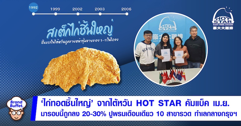 ฮ็อท สตาร์ (Hot Star) ไก่ทอดไซซ์ XXL สุดฮอตจากไต้หวัน กลับมาทำตลาดในไทยอีกครั้ง หลังจากหายไปหลายปี ล่าสุดเพจ HOT STAR Large Fried Chicken Thailand ประกาศข่าวดีให้แฟนๆ ได้เตรียมตัวพบกับการคัมแบ็คครั้งใหญ่ พร้อมเปิดสาขาแรกในไทย เดือนเมษายน 2568