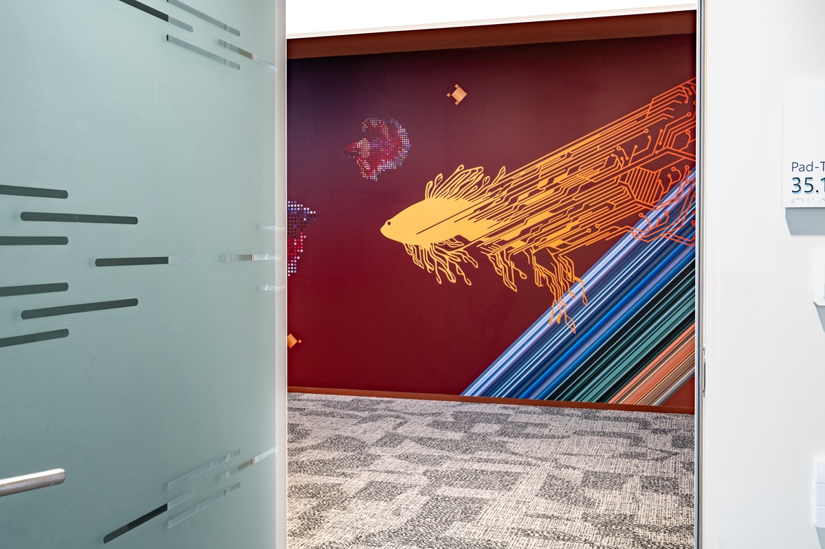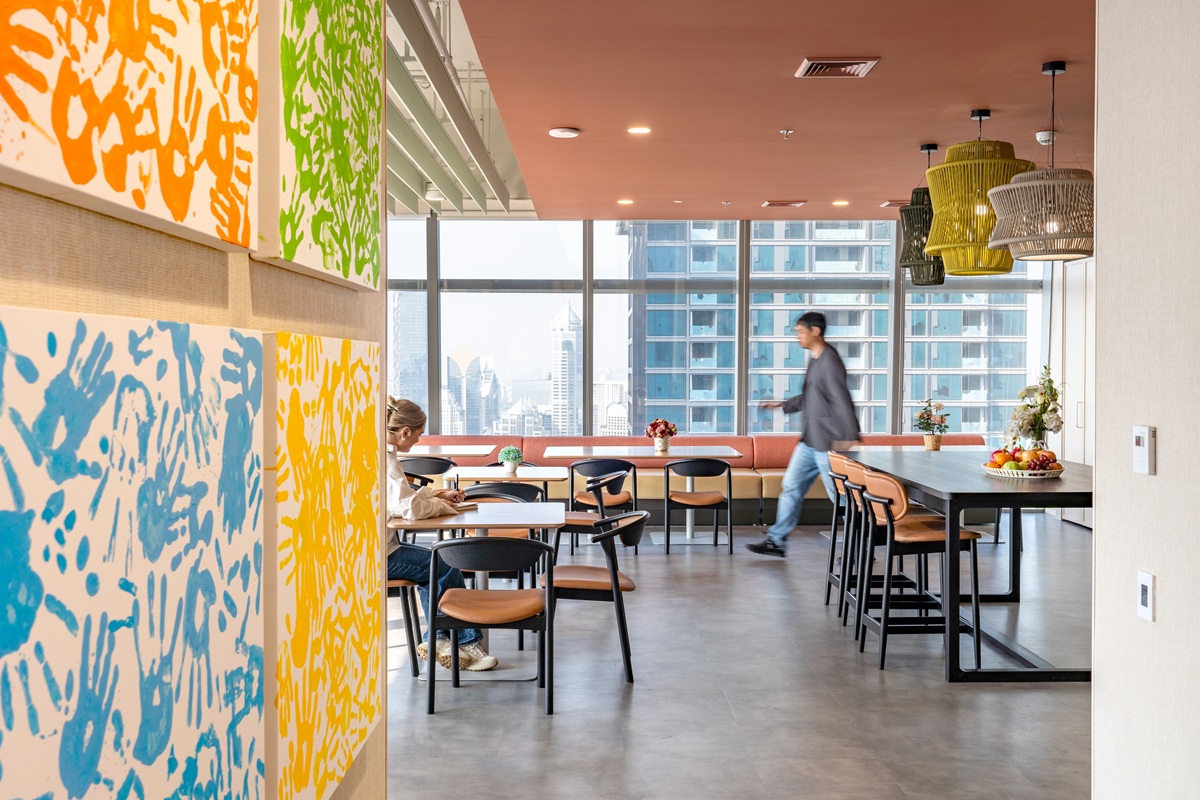 นอกจากการออกแบบออฟฟิศให้ตอบโจทย์การทำงานยุคใหม่แล้ว การผสานความล้ำสมัยให้เข้ากับเอกลักษณ์ความเป็นไทยก็ปรากฏอยู่ในบริษัทเทคโนโลยีแห่งนี้ด้วยเช่นกัน โดยพบว่ามีการใช้ลวดลาย วัสดุ หรือแม้แต่ชื่อที่สะท้อนถึงวัฒนธรรมไทย เช่น ลายดอกราชพฤกษ์ ปลากัด ปลาตะเพียน รวมถึงภาพหนุมานที่ประกอบขึ้นจากตัวอักษรและตัวเลขไทย