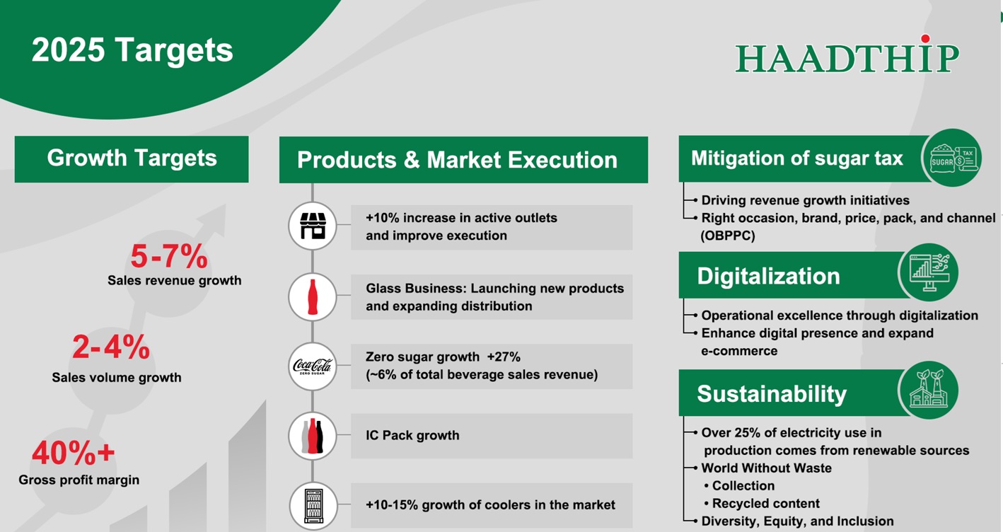 – ขยายตลาดผลิตภัณฑ์กลุมไม่มีน้ำตาล (Zero Sugar) ที่เติบโตต่อเนื่องตามเทรนด์ดูแลสุขภาพและปัจจัยภาษีน้ำตาล ปีที่ผ่านมากลุ่มนี้เติบโต 22.9% และมีสัดส่วนยอดขายกลุ่ม Zero Sugar 5% (เทียบเครื่องดื่มทั้งหมด) โดยวางแผนเปิดตัวผลิตภัณฑ์ใหม่เพื่อขยายกลุ่ม Zero Sugar ต่อเนื่อง โดยมีโอกาสเติบโตได้อีก ล่าสุดเปิดตัวผลิตภัณฑ์ใหม่ คือ “โค้ก ซีโร่ กลิ่นวานิลลา” ปี 2568 ตั้งเป้าหมายกลุ่ม Zero Sugar เติบโต 27%