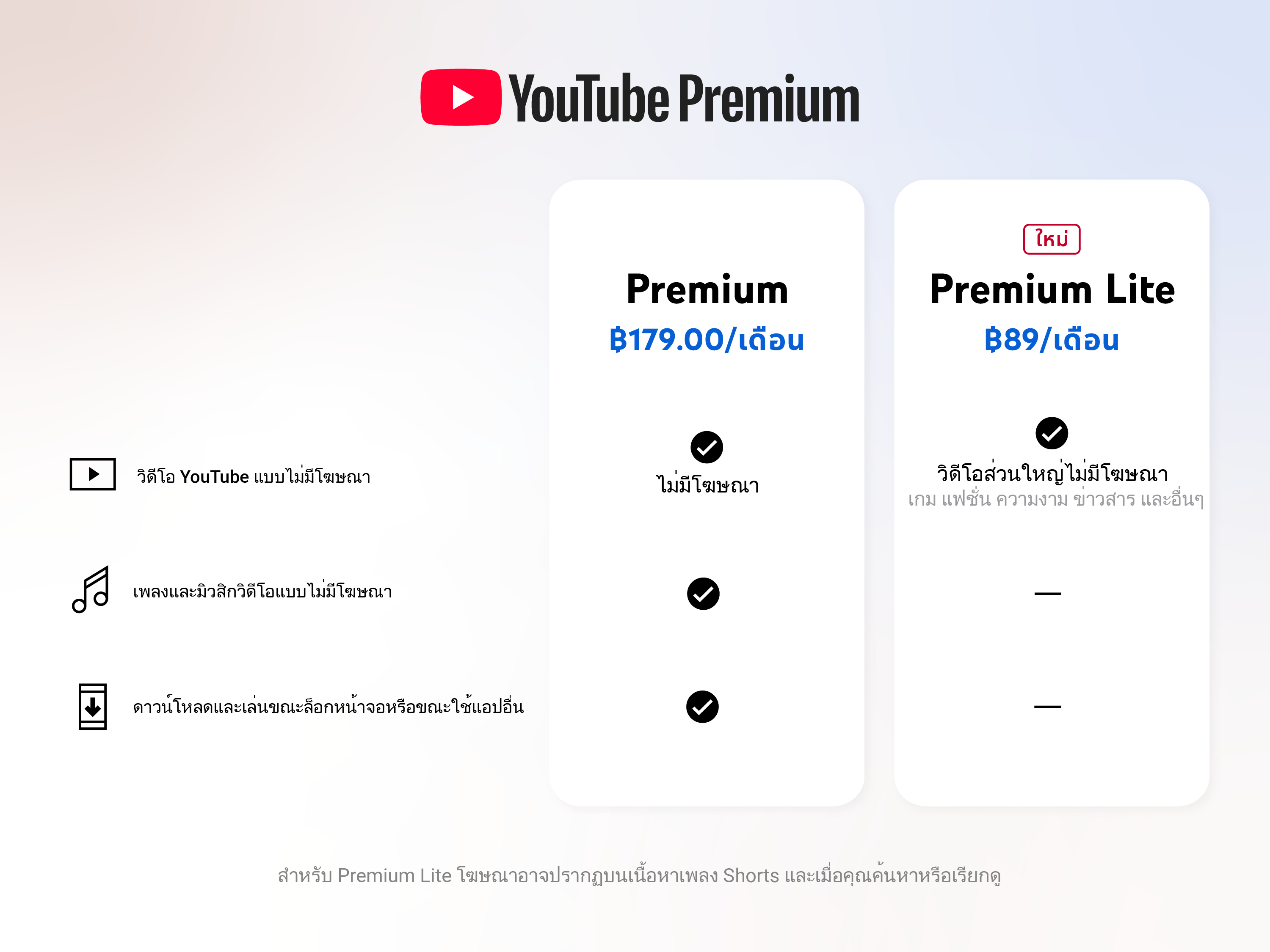 นอกจาก YouTube Premium ที่ผู้สมัครสามารถรับชมคอนเทนต์ต่าง ๆ บน YouTube ได้แบบไม่มีโฆษณาแล้ว อีกไม่นาน ผู้ใช้งาน YouTube ในไทยก็จะสามารถเข้าถึงบริการ YouTube Premium Lite ได้ด้วยเช่นกัน โดยมีราคาอยู่ที่ 89 บาทต่อเดือน